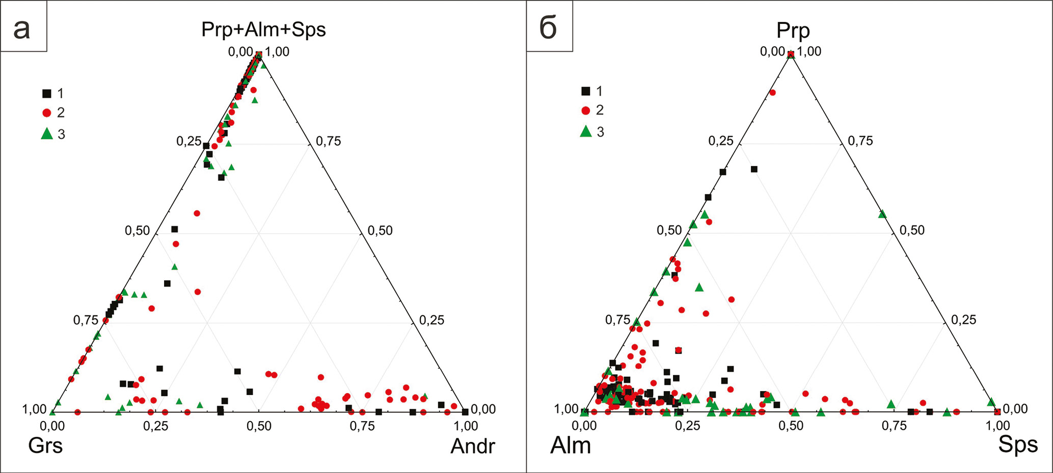 Fig. 5. Composition of garnets from heavy concentrates sampled from streams of the basin of the Kukulkindzha Creek in diagrams pyrope (Py) + almandine (Alm) + spessartite (Sps)-grossular (Grs)-andradite (Andr) (a) and pyrope-almandine-spessartite (б).