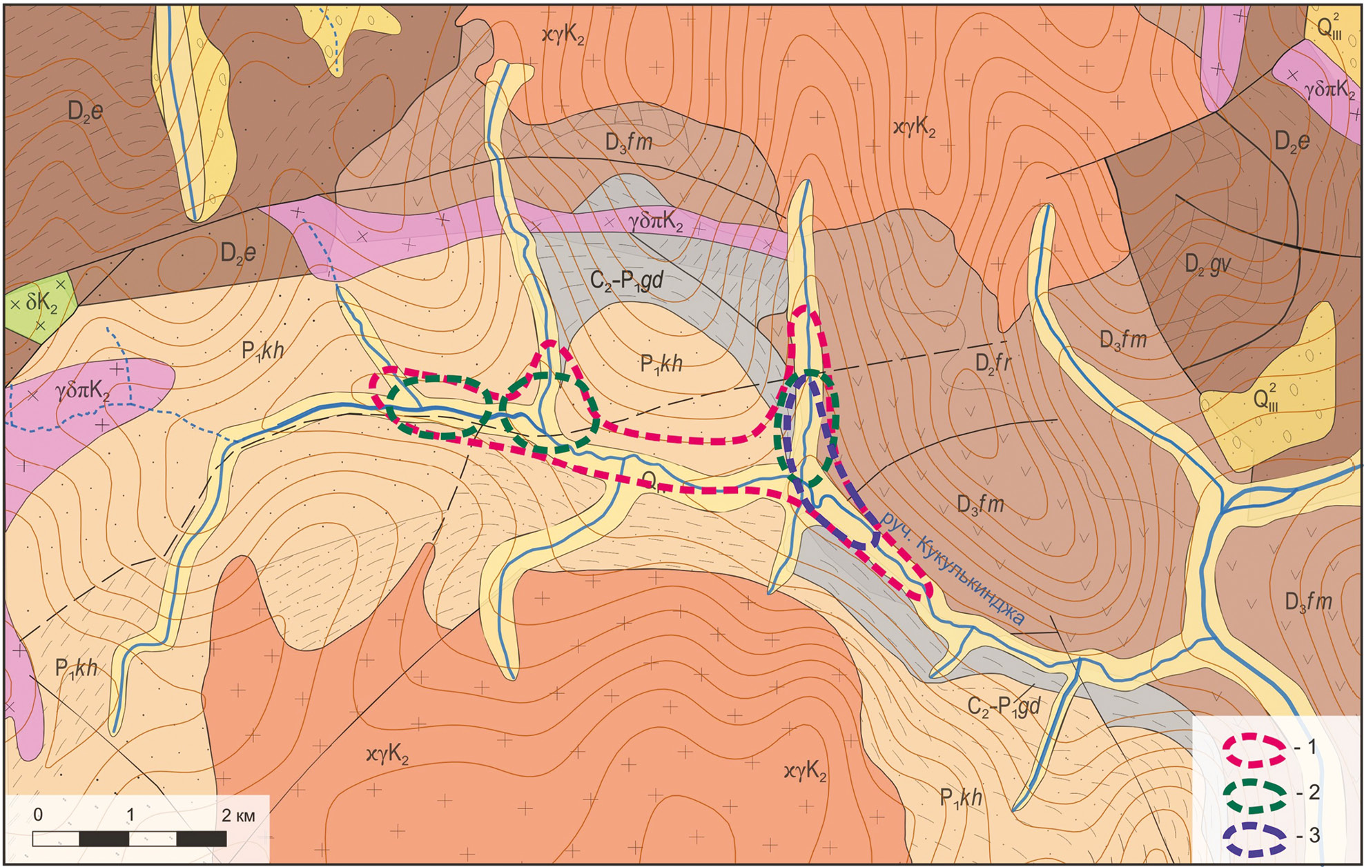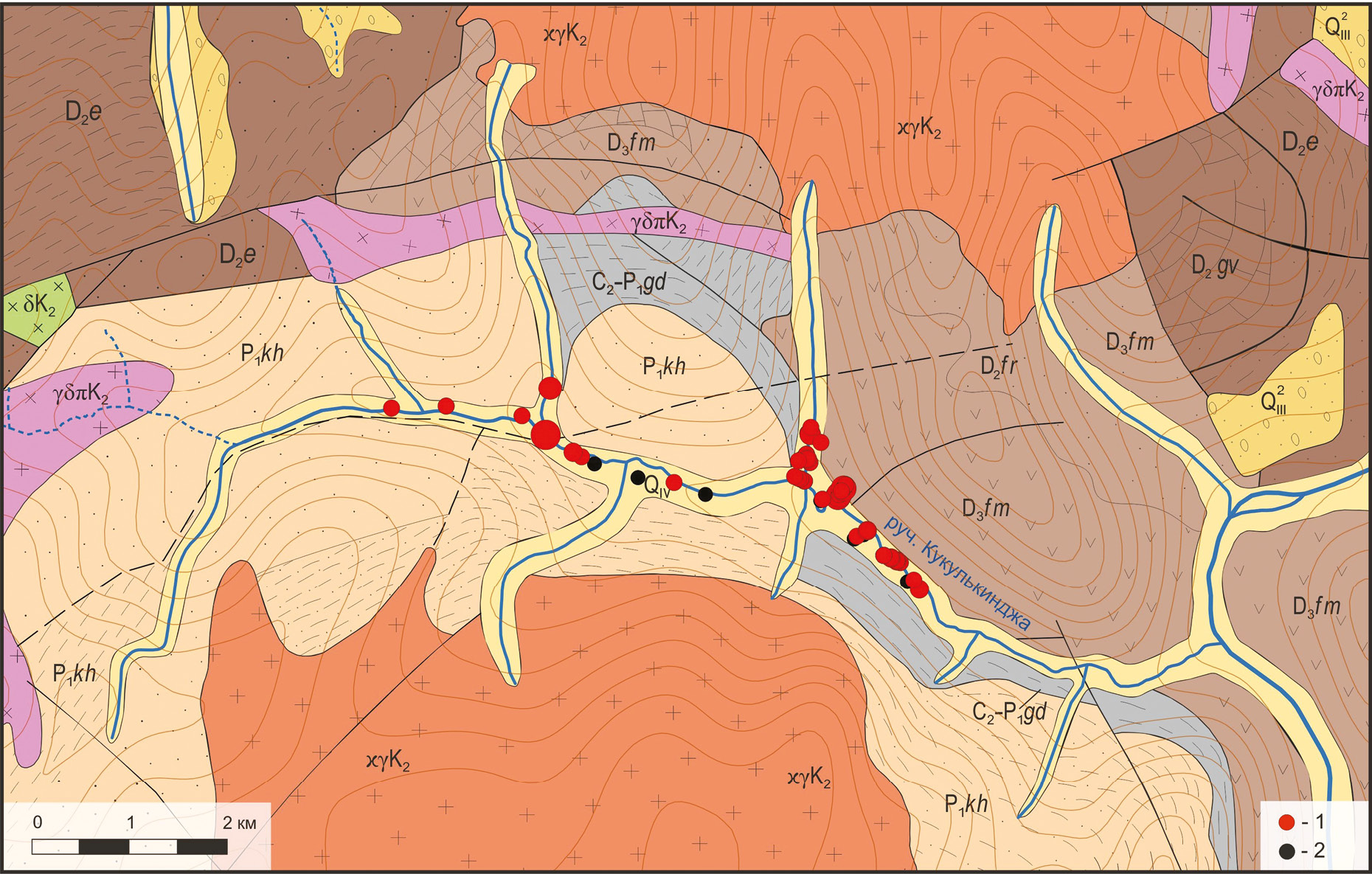 Ручей Кукулькинджа и его притоки поставляют обломочный материал с площади развития следующих комплексов (рис. 1): позднемеловых субщелочных гранитов, слагающих крупный массив на севере участка; верхнедевонских вулканогенных и терригенных пород с прослоями известняков в северо-восточной части участка; позднемеловых гранодиорит-порфиров и среднекарбоновых-нижнепермских терригенных пород в центральной и западной частях участка. Преобладающим распространением пользуются интрузивные образования. В зонах контакта интрузий с девонскими известняками находятся скарны и скарнированные породы (Братухин, Юдина, 1958ф; Зуев, 1985ф). Исходя из геологической ситуации, коренное золото здесь может быть связано со скарнами либо с кварцево-жильными проявлениями в субщелочных гранитах позднего мела.