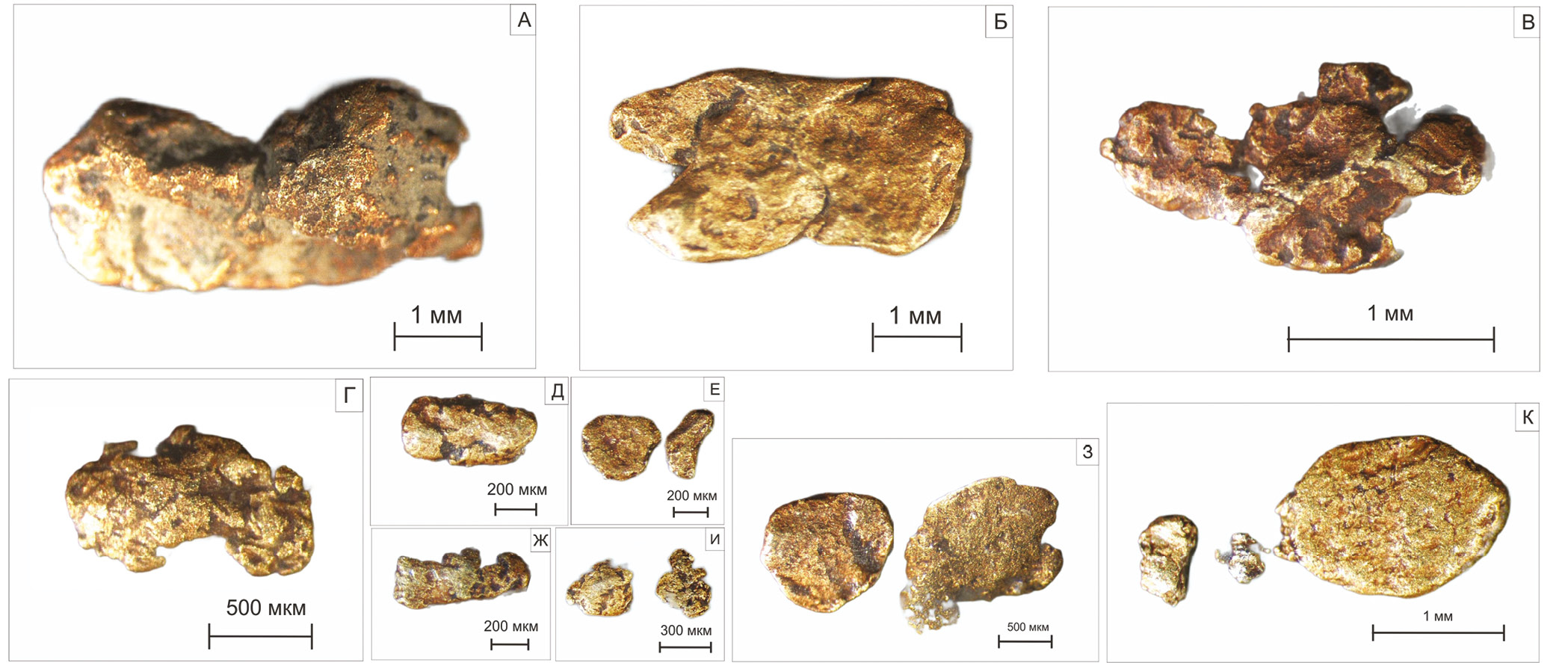 Fig. 7. Morphology of native gold grains from heavy concentrates sampled in streams of the basin of the Kukulkindzha Creek: а, г, д, ж – elongated lumpy, slightly curved with pitted surface; б – amoeboid flattened; в – dendritic; е, з, к – flattened lumpy with obtuse angles; и – complex relief.