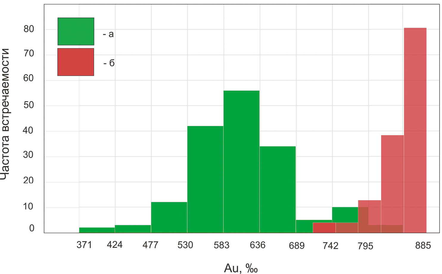 Состав самородного золота неоднороден. Единственной примесью является серебро – от 11.6 до 62.9 мас. %. Пробность золота варьирует от весьма низкой до средней. Два локальных максимума на гистограмме распределения пробности соответствуют преимущественному составу в центральных частях зерен с первичным золотом (530–689 ‰) и в каймах (848–885 ‰) (рис. 8). Для центральных участков изученной площади характерно бимодальное распределение пробности золота. Наблюдается главный пик со значениями 583–636 ‰ и слабый – 742–795 ‰.