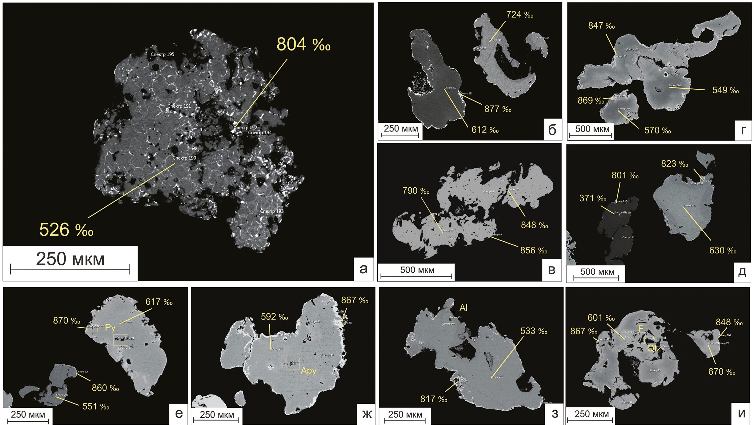 В одном случае установлен агрегат зерен с многочисленными тонкими высокопробными прожилками, развитыми по границам кристаллитов электрума (содержание Au 52.6 мас. %) (рис. 9а). Высокопробные оболочки остальных золотин маломощны, а прожилки практически отсутствуют. Из минералов золота также встречается кюстелит (рис. 9д): пробность центральной части составляет 371 ‰, а по границам развиваются тонкие более высокопробные каймы (до 801 ‰). Из включений в золоте присутствуют кварц, полевые шпаты, гидроксиды железа, пирит, арсенопирит и алланит (рис. 9е, ж, з, и).