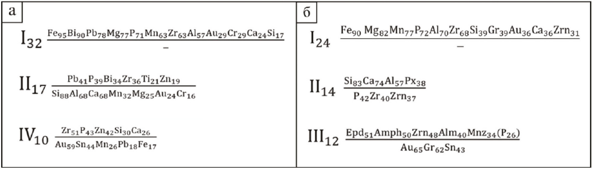 Статистическими методами выявлены три устойчивые шлихогеохимические ассоциации. Первая выделяется в первом факторе обеих выборок и обусловлена присутствием в шлихах минералов как субщелочных гранитов (гранатов альмандин-спессартинового состава, монацита, циркона, пирита, амфиболов, авгита, алланита), так и скарнов (гранатов гроссуляр-андрадитового ряда, диопсид-геденбергита). Две других выделяются во втором факторе обеих выборок. Одна представлена ассоциацией Si, Ca и Al с пироксенами и обусловлена присутствием в шлихах скарновых минералов – гроссуляр-андрадитовых гранатов, пироксенов ряда диопсид-геденбергит и эпидота. Другая представлена P и Zr и связана с акцессорными минералами субщелочных гранитов – монацитом и цирконом.