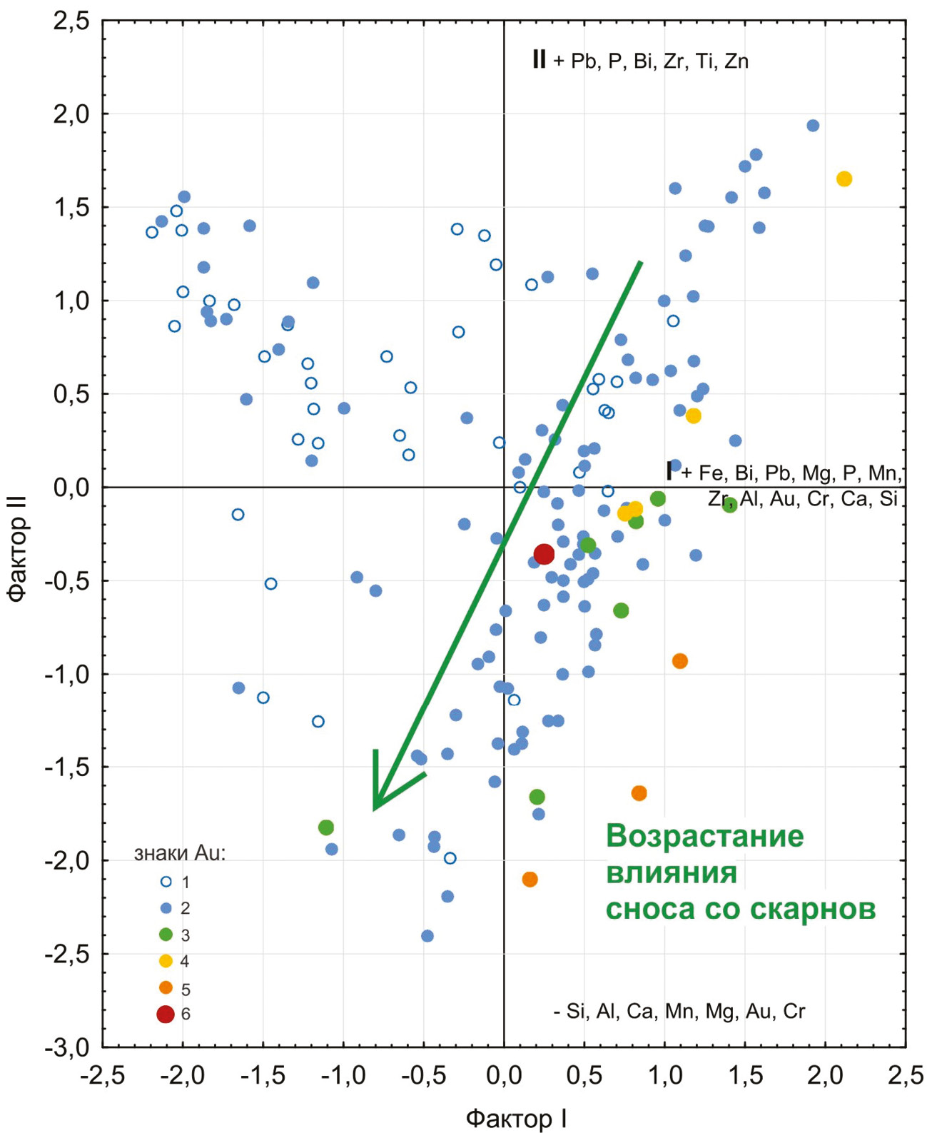 В выборке № 1 положительные факторные нагрузки имеют элементы, отвечающие акцессорным минералам субщелочных гранитов (монацит, циркон, титанит, рутил, сфалерит), а отрицательные – элементы скарновых минералов (гранаты гроссуляр-андрадитового ряда, пироксены диопсид-геденбергитового ряда, эпидот). Во втором факторе выборки № 2, наоборот, положительные факторные нагрузки имеют Si, Ca и Al – элементы гранатов гроссуляр-андрадитового состава и пироксенов диопсид-геденбергитового ряда. Отрицательные факторные нагрузки имеют P, отвечающий монациту, и Zr, отвечающий циркону, т. е. минералам гранитов. В структуре второго фактора выборки № 1 скарновая ассоциация обособлена вместе с самородным золотом.