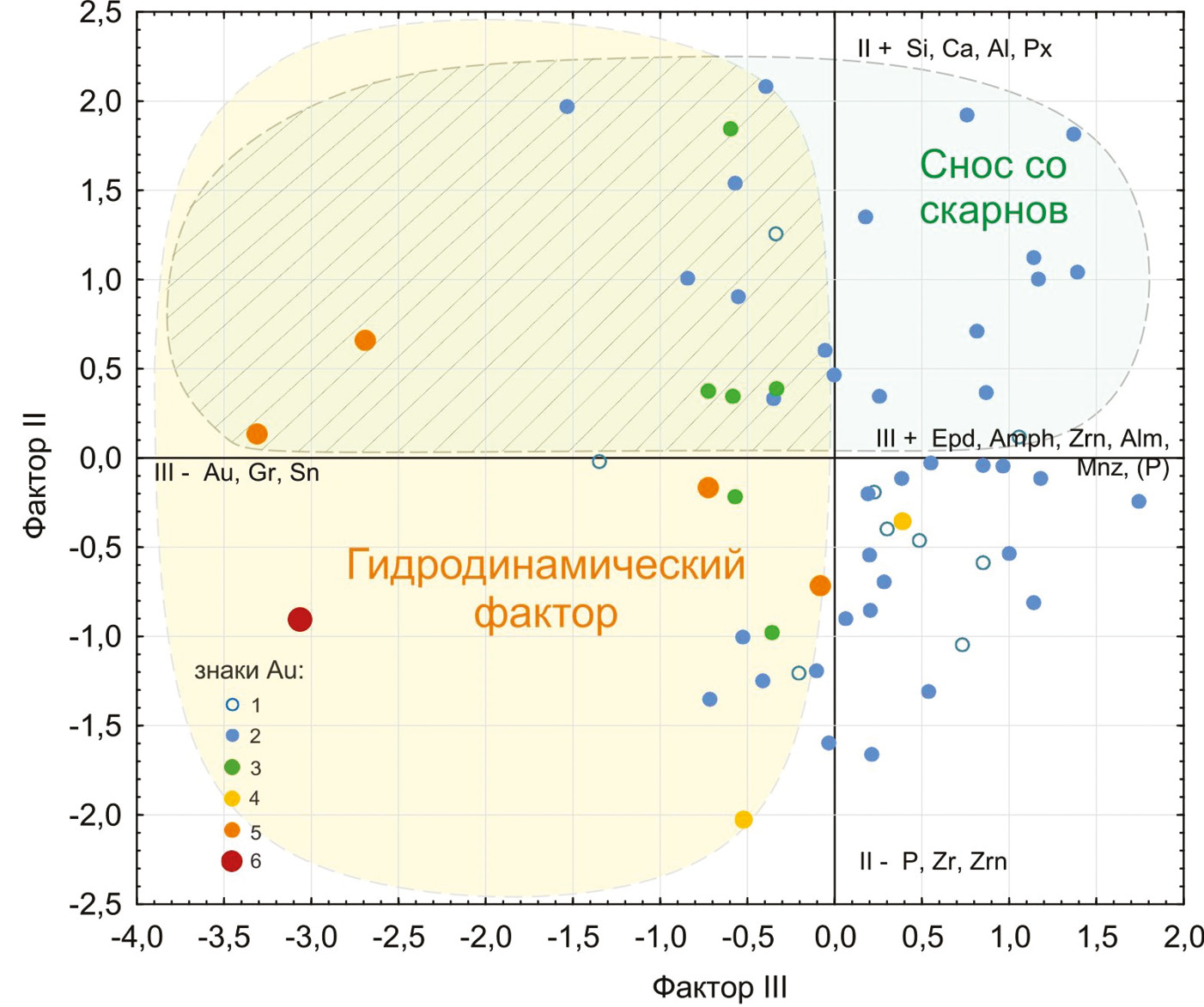 Фактор I в обеих выборках выявил ассоциацию химических элементов, отражающих минеральный состав тяжелой фракции шлиховых проб в целом. Выделяются элементы, связанные, в первую очередь, с акцессорными минералами субщелочных гранитов, но также и со скарновыми минералами: магнетитом, ильменитом, гранатом, монацитом, цирконом, алланитом, пиритом, амфиболом и пироксеном. Этот фактор – результат работы всех источников, существующих в пределах изучаемого участка. В выборке № 2 самородное золото по уровню факторной нагрузки группируется с кальциевыми гранатами и элементами, входящими в состав этих гранатов.