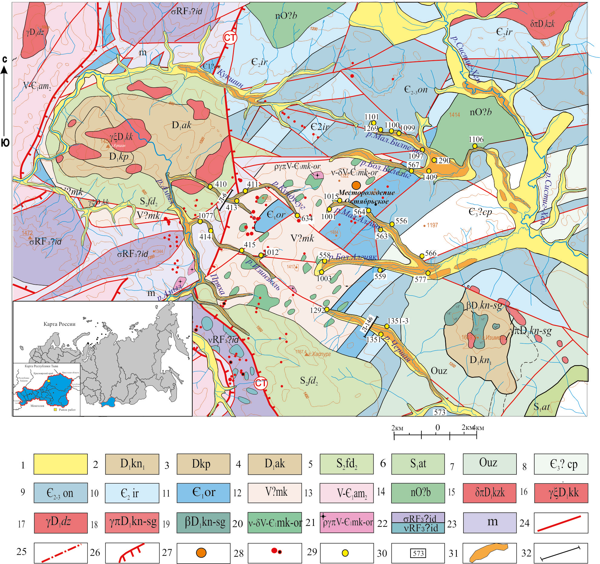 1 – Четвертичные отложения; 2–4 – нижний девон: 2 – кендейская свита, нижняя подсвита, андезиты, базальты; 3 – купхольская свита, трахириолиты, трахидациты, их туфы; 4 – актуругская свита, андезиты, базальты, трахиандезиты, их туфы; 5, 6 – силур: 5 – федоровская свита, верхняя подсвита, конгломераты, гравелиты, песчаники, алевролиты; 6 – атчольская свита, песчаники, красноцветные алевролиты; 7 – ордовик (систигхемская серия), узинская свита, песчаники, конгломераты, гравелиты; 8–11 – кембрий: 8 – чапшинская свита, ритмичное чередование конгломератов, песчаников, алевролитов; 9 – ончанская свита, алевролиты, аргиллиты, алевропесчаники, линзы гравелитов, известняков; 10 – иргитхемская свита, агломератовые туфы, конгломераты, песчаники, гравелиты, линзы известняков; 11 – орешская толща, глинисто-кремнистые и углеродисто-кремнистые сланцы, горизонты кварцитов, базальтов, их туфов, известняков (более 1280 м); 12, 13 – венд: 12 – макаровская толща, метабазальты, их туфы, кремнисто-глинистые сланцы, линзы известняков; 13 – амыльская свита, серицит-хлорит-альбит-кварцевые сланцы, линзы мраморов, метабазальтов; 14–22 – интрузивные породы: 14 – Систигхемская подзона, Булкинский расслоенный анортозит-габбровый комплекс, анортозиты, габбро, нориты, габбронориты, троктолиты, пироксениты; 15 – Кызыкчадрский габбро-норитовый комплекс, диориты, кварцевые диориты, габбро, габбродиориты; 16 – Куртушибинский офиолитовый пояс, Кукшинский сиенит-щелочногранитный комплекс, граносиениты; 17 – Джебашско-Амыльская подзона, Джойский гранитный комплекс, щелочные граниты; 18 – Кендейско-Саглинский базальт-риолитовый комплекс, гранит-порфиры, риолиты; 19 – базальты, микрогаббро; 20 – Макаровско-Орешский базальт-андезит-риолитовый комплекс, микрогаббро, долериты; 21 – плагиограниты, порфиры; 22 – Иджимский габбро-гипербазитовый комплекс, ультрабазитовая зона (σ): гарцбургиты, дуниты, серпентиниты, серпентинизированные породы, габброидная зона (ν): габбро, габбронориты, дайки микрогаббро, долериты, базальты; 23 – тектонический меланж; 24, 25 – разломы: 24 – установленные; 25 – неустановленной морфологии; 26 – надвиги; 27 – месторождение Октябрьское (94°35′30′′ в.д., 53°05′ с.ш.); 28 – точки золоторудной минерализации; 29 – точки наблюдения (т. н.); 30 – номера проб; 31 – россыпи; 32 – положение геологических разрезов.