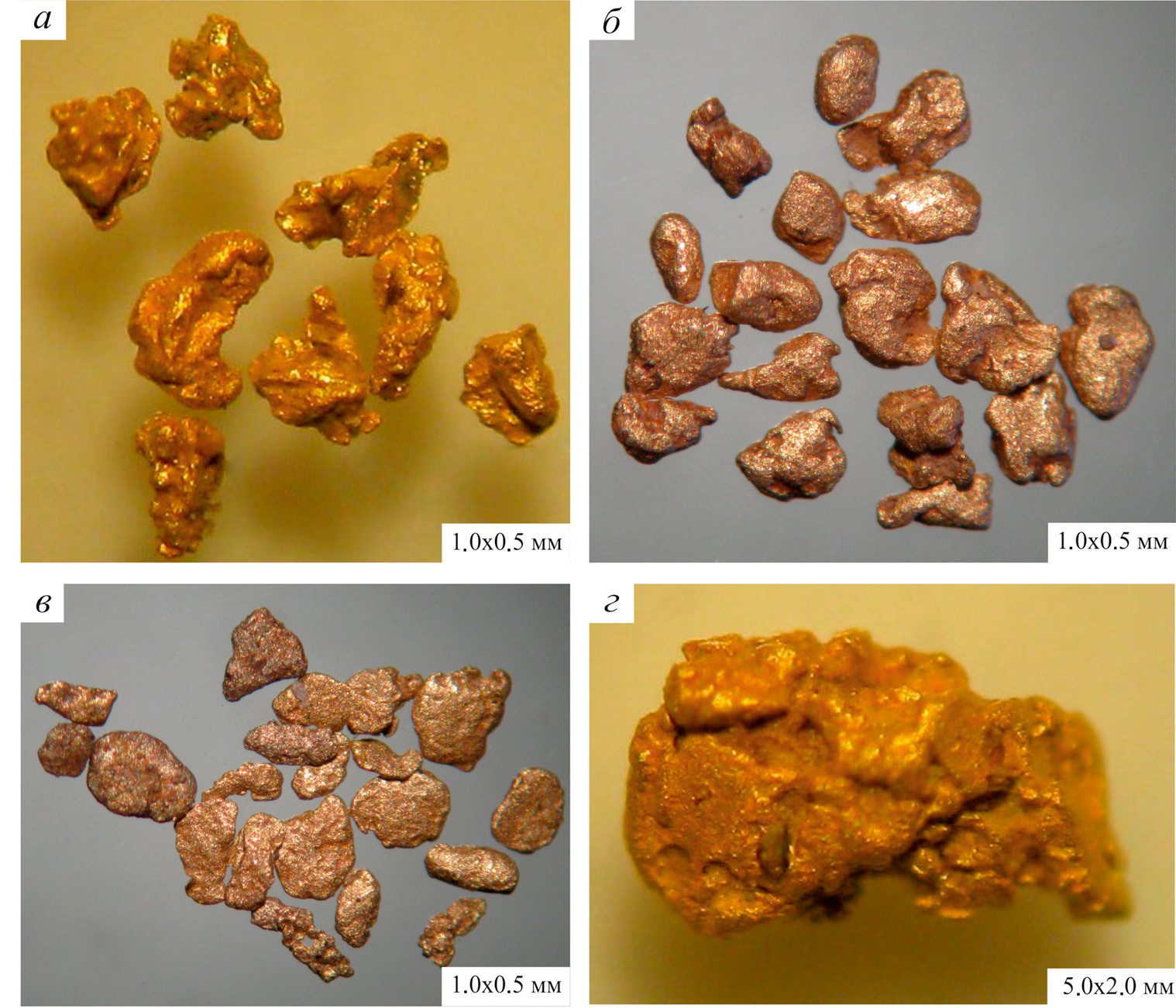 Fig. 2. Morphological features of placer gold: a – lumpy, unrounded, o. p. 1001 (Maly Algiyak River); б – isometric, lumpy, rounded, o. p. 559 (Bolshoi Algiyak River); в – lamellar, rounded, o. p. 573 (Chernaya River); г – angular aggregate of particles, o. p. 1015 (Maly Algiyak River).