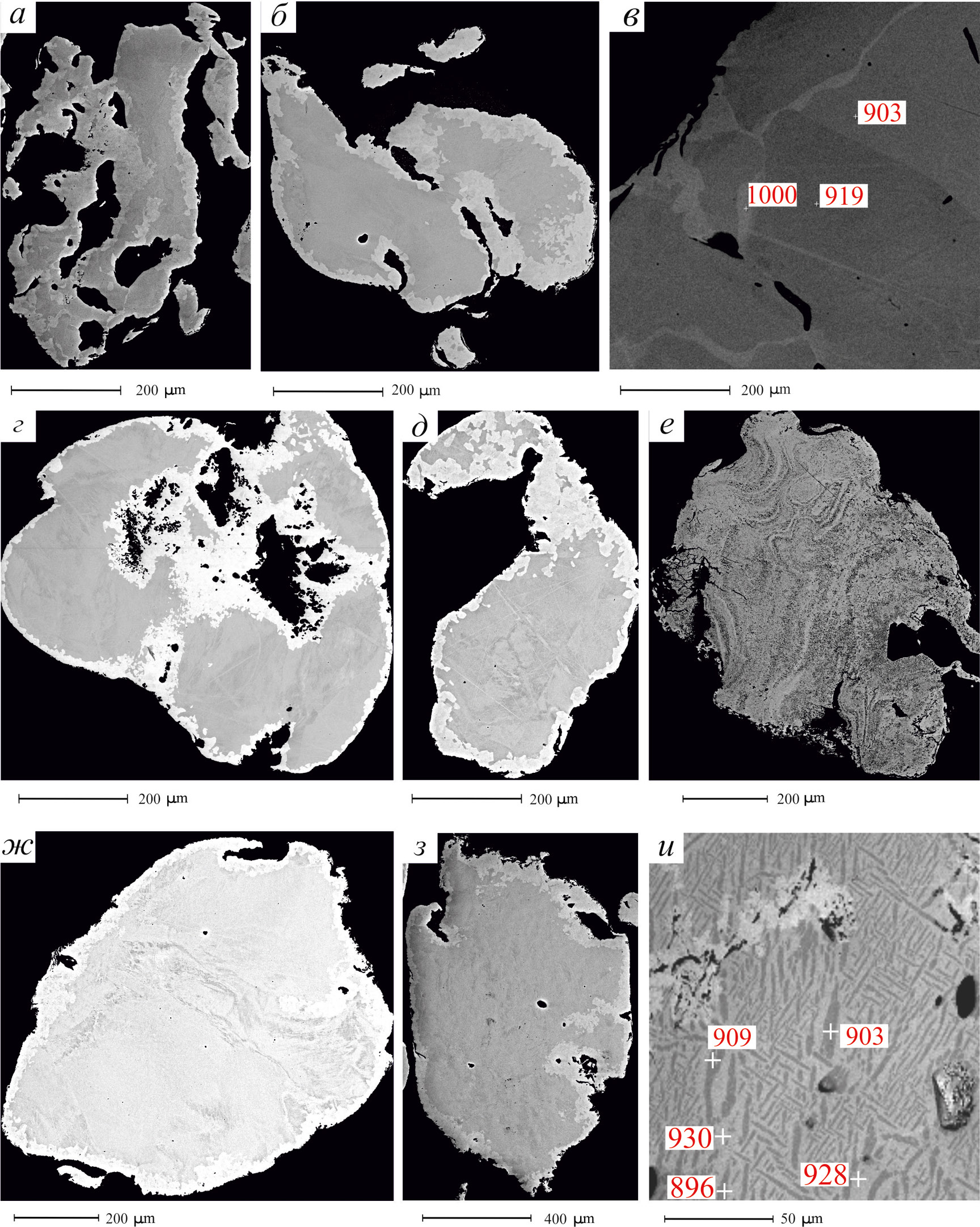 Рис. 3. СЭМ фото срезов россыпного золота Амыло-Систигхемского рудно-россыпного района: а – неокатанная ксеноморфная частица с высокопробной каймой и линзовидно-пятнистым неоднородным ядром; б – окатанная частица с высокопробной каймой и шиповидными отростками нового золота на поверхности; в – фрагмент агрегатной (гранобластической) частицы с чешуйчатыми отростками аутигенного золота на поверхности и межзерновыми прожилками высокопробного золота; г – агрегат слипшихся частиц с высокопробными каймами; д – изогнутая частица с высокопробной каймой и пятнисто-неоднородным ядром, образовавшимся после изгиба частицы; е – изометричная окатанная частица с шиповидными и чешуйчатыми отростками аутигенного золота на поверхности и плойчато-милонитовой внутренней структурой, в которой полосы разной интенсивности серого цвета отражают различную пробность; ж – окатанная частица с высокопробной каймой, шиповидными и чешуйчатыми отростками аутигенного золота на поверхности и ядром с милонитовой структурой; з – неокатанная гипидиоморфная частица с высокопробной каймой и пятнисто-неоднородным ядром; и – фрагмент частицы медистого золота с пластинчато-решетчатой структурой, в которой светлые и светло-серые пластинки имеют состав Cu-Ag-Au с пробностью 930 ‰ и Cu-Au с пробностью 896 ‰, соответственно.