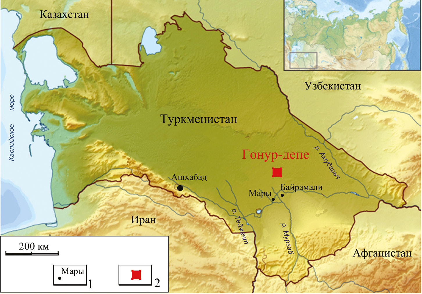 Рис. 1. Местоположение объектов на территории Туркменистана. 1 – современные населенные пункты, 2 – место раскопок археологического комплекса Гонур-депе.