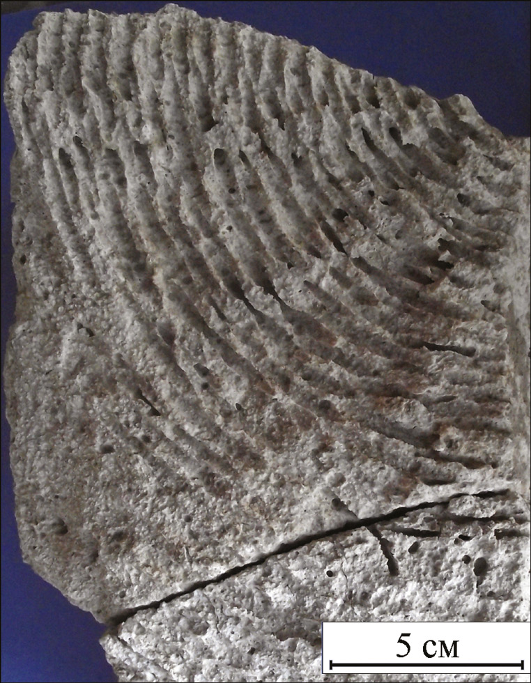 Исследования с помощью сканирующего электронного микроскопа позволили выявить в наполнителе корзины органическое вещество, в том числе и реликты водорослей, которые по форме, строению и составу предположительно относятся к диатомовым. Водоросли образуют буроватые цепочечные колонии, состоящие из мелких одноклеточных индивидов размером от 1–2 до 50 мкм. Клетка протопласта покрыта пектиновой оболочкой, заключенной в опаловом цементе с отчетливым тонким рисунком среза пор и ареол (рис. 5a). Поскольку диатомовые водоросли встречаются не только в морских и пресноводных водоемах, а также в воздушной, наземной и почвенной среде, проникая на глубину до 3 м (Голлербах, 1951), возможно, что фрагмент изученной корзины был захоронен в почве или вблизи водоема.
