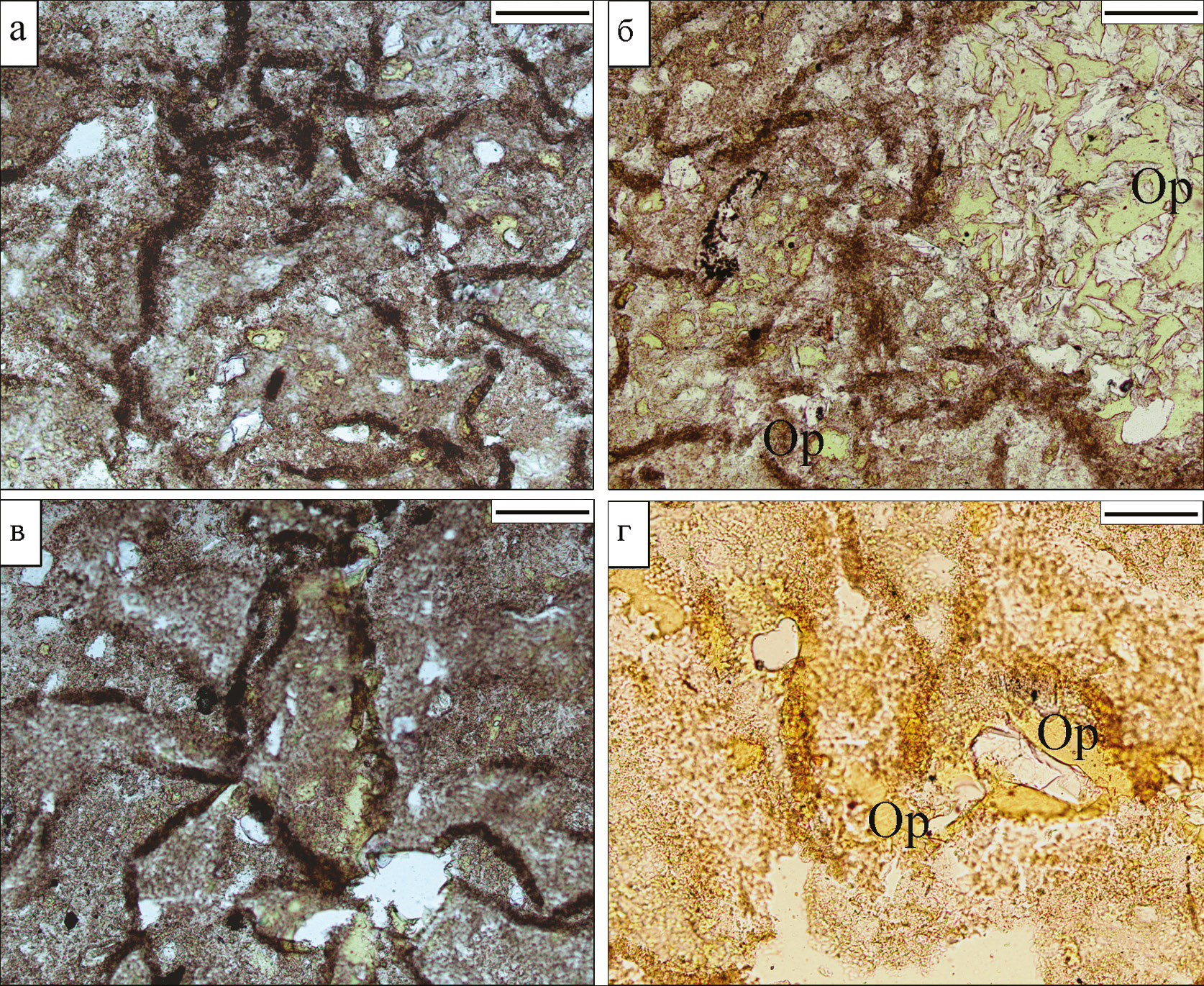 Fig. 4. Pores and syneresis cracks in clay-gypsum mass: a – matrix with gypsum aggregates (gray) and pores (light gray) partly filled with opal (dark gray to black); б – gypsum aggregates with pores completely made of opal (Op) and syneresis cracks with brownish organic matter; в – matrix with rare pores and syneresis cracks with organic matter; г – areas with opal (yellowish) confined to cracks with organic matter (brown).