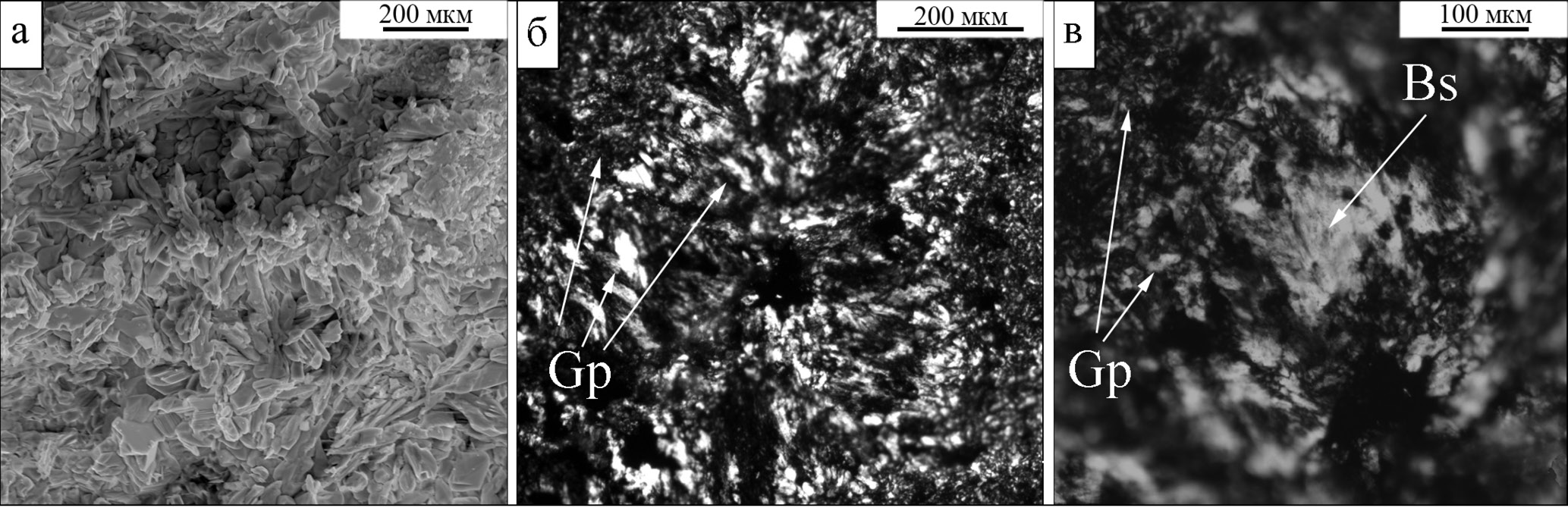 Fig. 7. Morphology of newly formed minerals in gypsum material: a – intergrowths of small gypsum crystals; б – prismatic and acicular gypsum aggregates on walls of the cavity; в – gypsum aggregates in the marginal part of the pore and radiant-fibrous bassanite aggregates in the center. SEM photo (a), transmitted light with analyzer (б, в).
