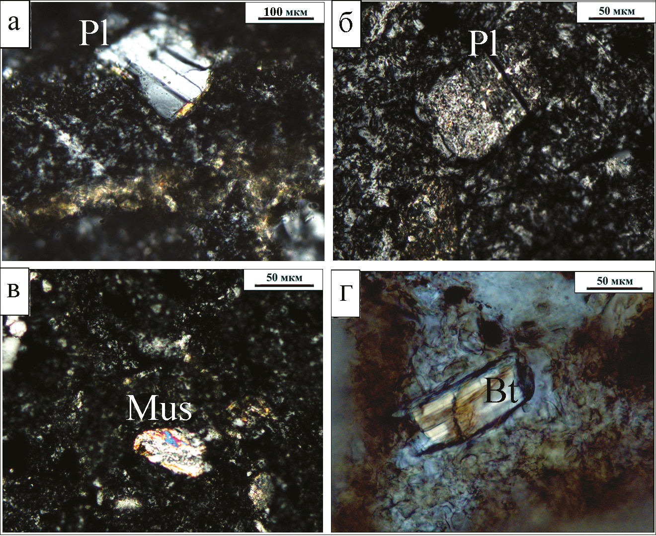 Рис. 9. Обломки минералов в глинисто-гипсовом цементе: а – деформированное зерно плагиоклаза с полисинтетическими двойниками; б – зерно серицитизированного плагиоклаза; в – чешуйки мусковита (Mus); г – пластинка биотита.