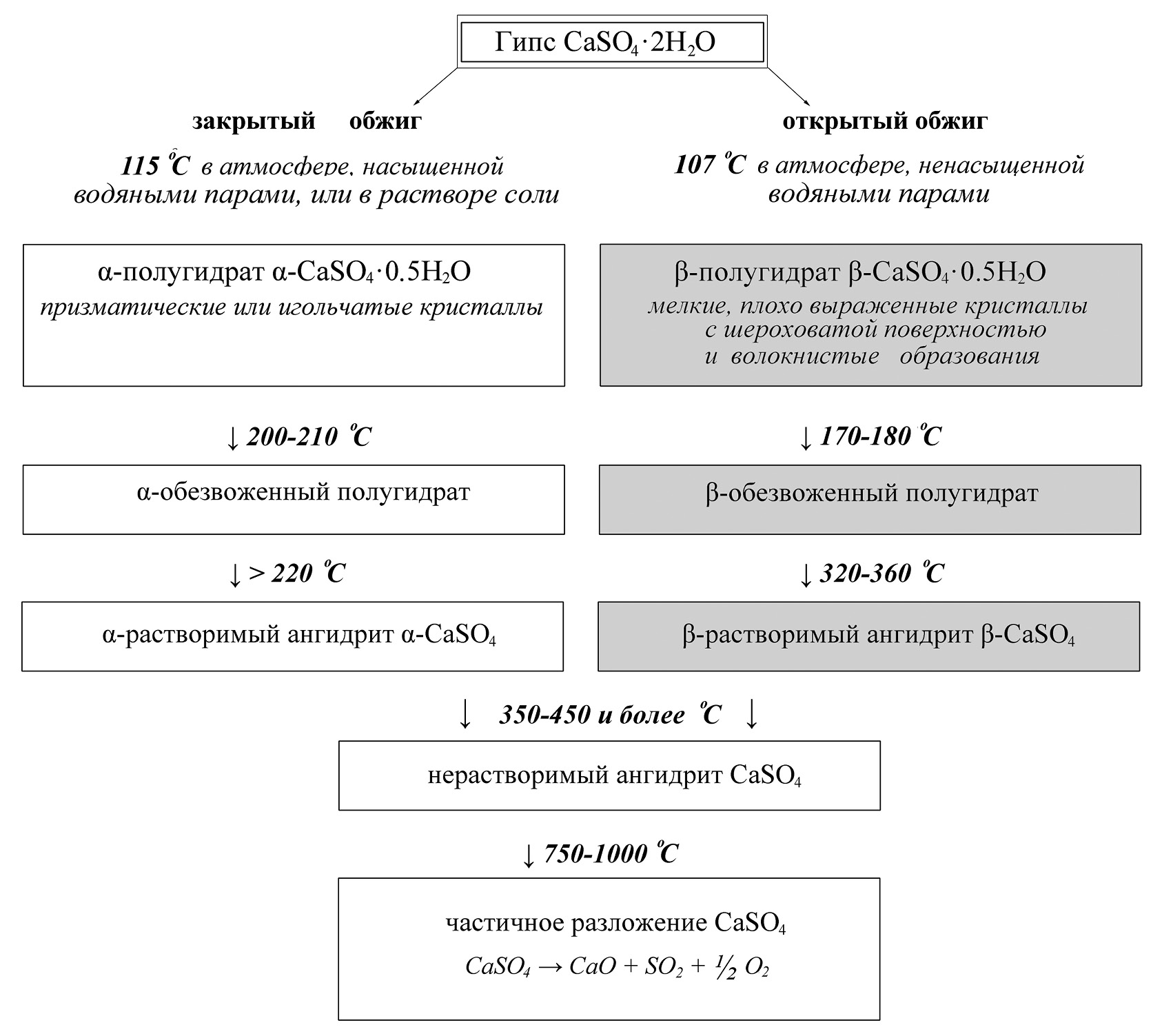 Согласно экспериментальным данным (Косенко, 2015), в гипсе при нагревании выше 65 °С начинаются процессы дегидратации. В температурном интервале 110–120 °С сырье превращается в бассанит. Последний в зависимости от типа обжига может иметь две модификации: α и β. Если обезвоживание осуществляется в паровлажносной среде или в водном растворе (закрытый обжиг), то образуются хорошо оформленные плотные призматические или игольчатые кристаллы α-полугидрата. При прогреве на открытом воздухе получаются волокнистые шероховато-пористые агрегаты или мелкие плохо выраженные кристаллы β-разновидности. При этом общая пористость материала резко увеличивается и может достигать 30 %.
