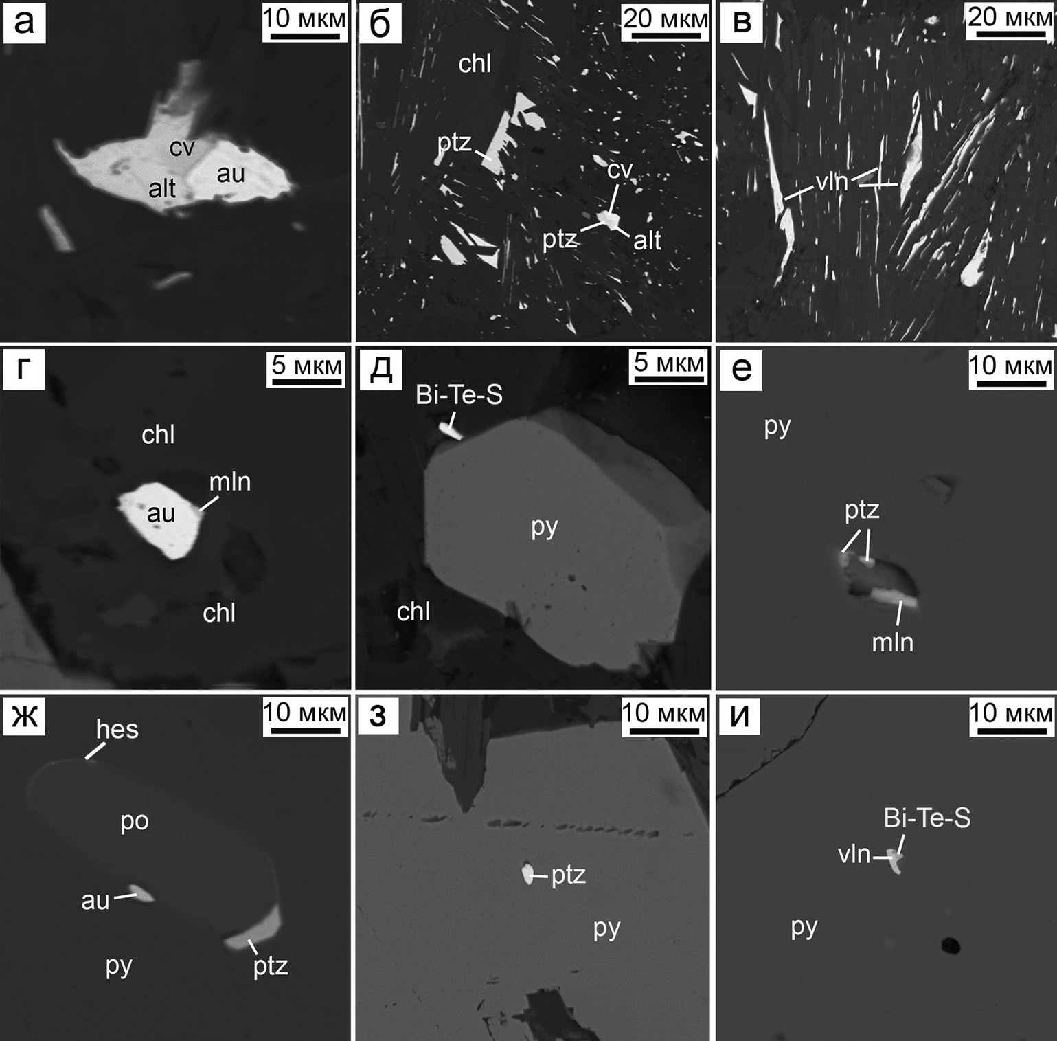 Рис. 9. Морфология самородного золота и теллуридов в слюдисто-хлоритовой (а–д) и пирит-пирротиновой (е–и) ассоциациях: а – сросток самородного золота (au), алтаита (alt) и калаверита (cv) среди нерудных минералов; б – сросток калаверита, петцита (ptz) и алтаита и включения петцита в хлорите и слюде (chl); в – включения волынскита (vln) по спайности в хлорите и слюде; г – включение самородного золота с каймой мелонита (mln) в хлорите; д – удлиненное зерно минерала Bi-Te-S на контакте пирита (py) и нерудной массы; е – вытянутые включения петцита и мелонита в пирите; ж – включения самородного золота, петцита и гессита (hes) по контурам овального включения пирротина (po) в пирите; з – угловатое включение петцита в пирите; и – сросток волынскита и минерала Bi-Te-S в пирите. BSE фото.