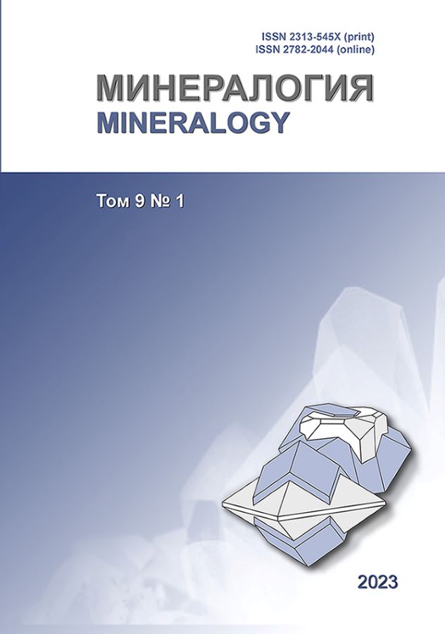 Микроморфология и химический состав минералов изучались с использованием сканирующего электронного микроскопа (СЭМ) Hitachi FlexSEM 1000 с ЭДС-детектором Xplore Contact 30 и системой анализа Oxford AZtecLive STD при ускоряющем напряжении 20 кВ, диаметре зонда 2 мкм и поглощенном токе 5 нА на эталоне – металлическом кобальте (аналитик А.В. Касаткин). Определявшиеся элементы, аналитические рентгеновские линии и стандарты: AlKα – кианит; SiKα – SiO2; SKα и FeKα – FeS2; ClKα – TlCl; MnKα – Mn2SiO4; NiKα – Ni; CuKα – Cu; AgLα – Ag; TeLβ – HgTe; CdLβ – Cd; AuMα – Au; PbMα – PbSe и PbWO4; BiMβ – Bi2WO6. На СЭМ изображениях использованы символы, рекомендованные Комиссией по новым минералам, номенклатуре и классификации Международной минералогической ассоциации (Warr, 2021).