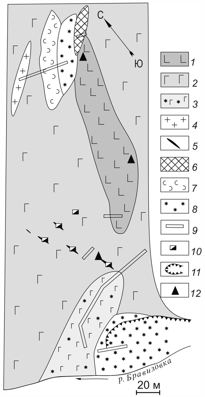 Полосчатое расположение разных минеральных тел через 77 лет более подробно описал В.С. Мясников (1954), не приведя собственной схемы. С востока на запад в обнажениях вдоль крутого северного берега р. Бравиловки он перечислил следующие образования: кварцевая жила мощностью 2.5 м в хлоритовой мелкозернистой породе; крупнозернистое габбро (А – на схеме Мушкетова); эпидотизированное габбро с участками амфиболовой породы (Б? – на схеме); пласт плотной магнетит-хлоритовой породы (дайка?); зеленый хлоритовый сланец; выветрелая хлорит-диопсидовая порода с клиногумитом; лейхтенбергитовый сланец с разнообразными минералами (Е? – по Мушкетову) – «тальк-апатит», лейхтенбергит, хлорошпинель, гематит, магнетит, магнезиоферрит, андрадит, перовскит, ксантофиллит, пятна и скопления граната с лейхтенбергитом и перовскитом (в миаролах?); гранат-везувиановые породы в ядре линзы; амфиболит с дайкой мелкозернистого габбро, эпидотизированного и местами рассеченного прожилками аплита по ряду поперечных трещин; вместе с этими прожилками наблюдаются турмалин, альбит, пирит и актинолит; микрогаббро подверглось местами гранатизации (!); несколько метров к западу в выработке Егорова добывался лейхтенбергит (друзы) и здесь же отмечен прослой мощностью 0.5 м амфибол-хлоритовой породы (дайка? – В.П.); серпентин-хлоритовая сильно выветрелая порода с миаролами граната, перовскита и кальцита; хлорит-гранат-диопсидовая порода; темно-зеленый хлоритовый сланец с пустотами и «тальк-апатитом»; пласт гранатовой породы мощностью 0.3 м; габбро. Итого 13 тел разных горных пород.