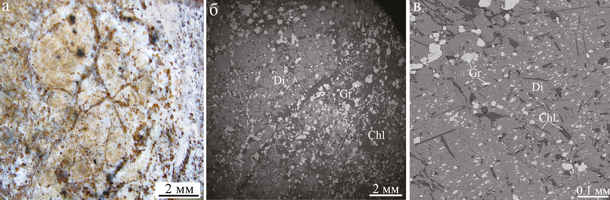 В некоторых образцах скарнов наблюдается полосчатость (зональность?), образованная разными количественными соотношениями одних и тех же минералов (рис. 24а). Слой с преобладанием диопсида выглядит буроватым из-за большого количества мелких включений в диопсиде коричневого граната андрадита (рис. 24а, в). Светлый слой представлен массой мелкозернистого бесцветного (белого) клинохлора с редкими вкраплениями более крупного андрадита (рис. 24а, б, правая часть). Акцессорными минералами в этих агрегатах являются гидроксилапатит, кальцит и перовскит. Химические особенности минералов отражены в эмпирических формулах: андрадит (a) Ca3Fe1.83Al0.04Mg0.05 Ti0.08(SiO4)3, клинохлор (b) Mg4.9Al0.92Fe0.18(Si3Al)O10(OH)8, перовскит (e) (табл. 4, № 4, 5) Ca0.96Ce0.01Fe0.03Ta0.002TiO3, кальцит (f) Ca0.92Mg0.04Mn0.03Fe0.01CO3, диопсид (i) Ca0.98 Mg0.96Fe0.06Al0.06Ti0.02Si1.91O6, гидроксилапатит (n) (табл. 3, № 4) Ca5(P2.45S0.26Si0.29)O12(OH0.69F0.08Cl0.23). Между всеми минералами есть индукционные поверхности одновременного роста. В диопсиде синхронные включения клинохлора имеют пластинчатую форму с кажущимся идиоморфизмом (рис. 24в).