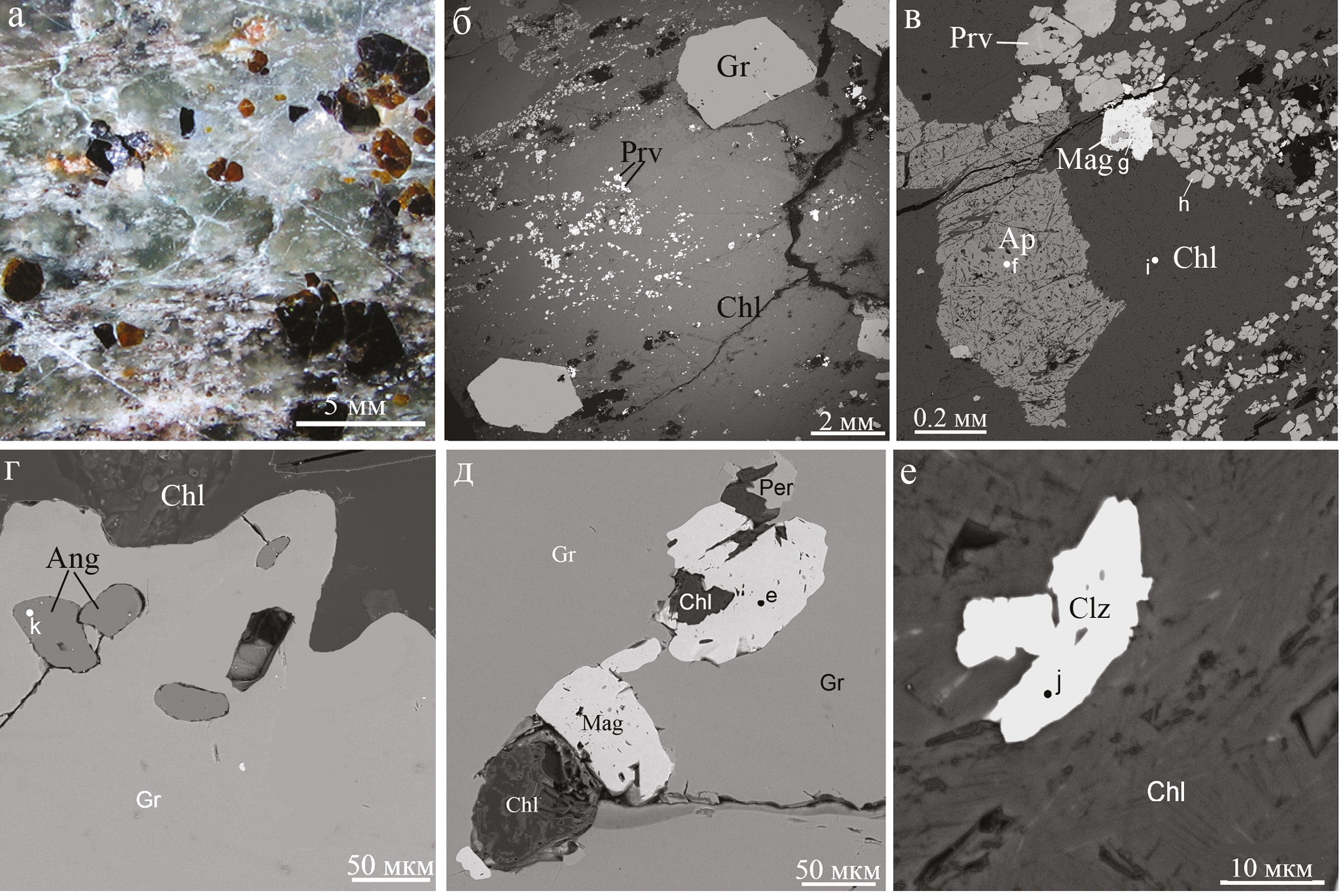 Гранат-хлоритовую породу (рис. 25) хочется отнести к метасоматическим скарнам, но в ней не найдены псевдоморфозы и отсутствуют «тени» первичных структур. Гранат-андрадит местами имеет фрагменты граней ромбододекаэдров, но чаще – индукционную поверхность с клинохлором (рис. 25а, г). Мелкие вростки ангидрита приурочены к поздним зонам роста индивидов граната (рис. 25г). Мелкие индивиды перовскита, апатита, магнезиоферрита, ангидрита и кальциртита имеют индукционные границы друг с другом и с андрадитом, клинохлором (рис. 25а–е). Химические особенности минералов зафиксированы в эмпирических формулах: андрадит (a) Ca3Fe1.72Al0.11Ti0.15Mg0.02(SiO4)3, клинохлор (c) Mg4.74Al1.04Fe0.22(Si2.85Al1.15)O10(OH)8, магнезиоферрит (e) (Mg0.46Fe0.27Mn0.24Zn0.03)Fe2O4, гидроксилапатит (f, табл. 3, № 5) Ca5(P2.76S0.10Si0.10V0.03)O12(OH0.82F0.15Cl0.03), перовскит (h, табл. 4, № 6, 7) Ca0.99Fe0.02Ti0.99O3, кальциртит (j, табл. 2, № 7) Ca2 Zr4.84Hf0.05Fe0.06Sr0.05Ti2O16, ангидрит (k) Ca0.99 Fe0.01 SO4. Не имея данных о геологической позиции тела гранат-хлоритовой породы, ее сложно отнести к метасоматической по структурной характеристике. Скорее, она сходна по истории кристаллизации минералов с известными в районе Шишимской копи амфиболовыми, магнетитовыми и доломитовыми магматическими хлоритолитами.