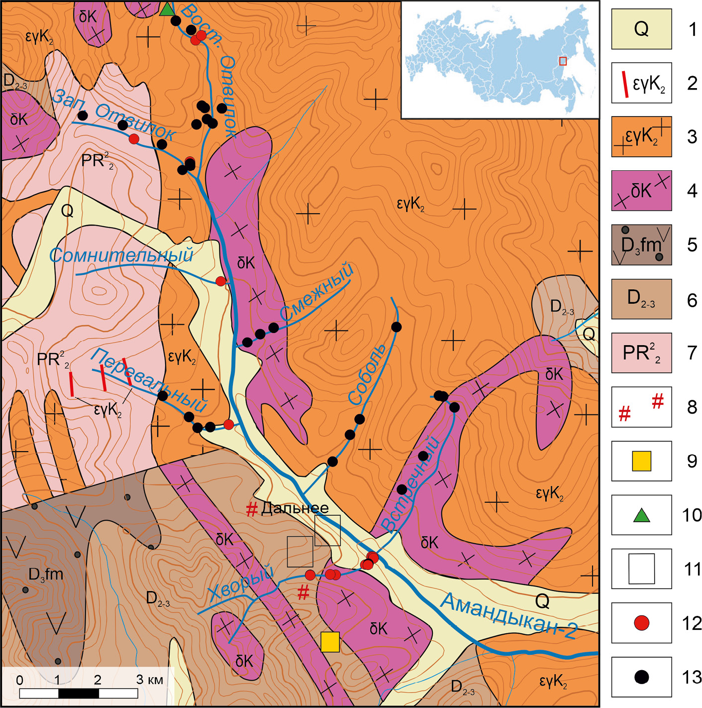 Fig. 1. Scheme of geological structure of the basin of the Anmandykan 2nd Creek, after (Matyusha, 2009). 1 – Quaternary sediments: sand, pebble, boulder, loam; 2 – Cretaceous alkaline granitoid intrusions: 2 – phase 3: dikes of alkali feldspar and alkali ribekite-arfvedsonite granite; 3 – phase 2: syenogranite, alkali feldspar granite; 4 – phase 1: tonalite, granodiorite, diorite, quartz monzodiorite; 5 – Late Devonian volcanoterrigenous complex: andesite tuff, tuff sandstone, conglomerate, calcareous-clayey shale; 6 – Middle-Late Devonian carbonaceous-terrigenous-carbonate complex: calcareous sandstone, calcareous-clayey shale, limestone, conglomerate; 7 – Late Proterozoic carbonaceous-siliceous-dolomite complex: dolomite, sandy dolomite, quartzite-sandstone, chert, siltstone; 8–11 – ore mineralization points (Zuev, 1985, Matusha, 2009): 8 – hydrothermal and contact altered rocks, skarns, Dalnee occurrence; 9 – sedimentary-hydrothermal gold-silver-polymetallic type (Au, Ag, Sb, Pb, Zn, Cu, As); 10 – plutonic-hydrothermal silver-polymetallic type (Ag, Pb, Zn); 11 – skarn gold-silver- polymetallic type (Au, Ag, Pb, Zn, Cu, W, As); 12, 13 – sampling points of heavy mineral concentrates with (12) and without (13) gold.
