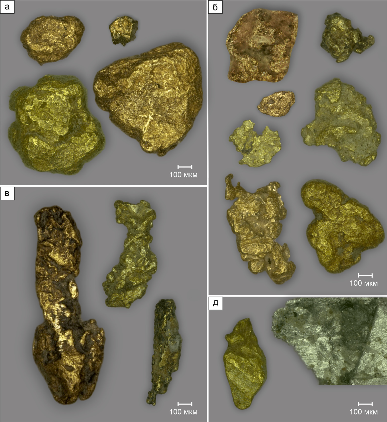 Рис. 3. Самородное золото различной морфологии из шлиховых проб, отобранных из водотоков бассейна руч. Анмандыкан 2-ой: а – изометричное средней окатанности; б – комковидное, полуокатанное; в – удлиненное; д – с отпечатками штриховки.