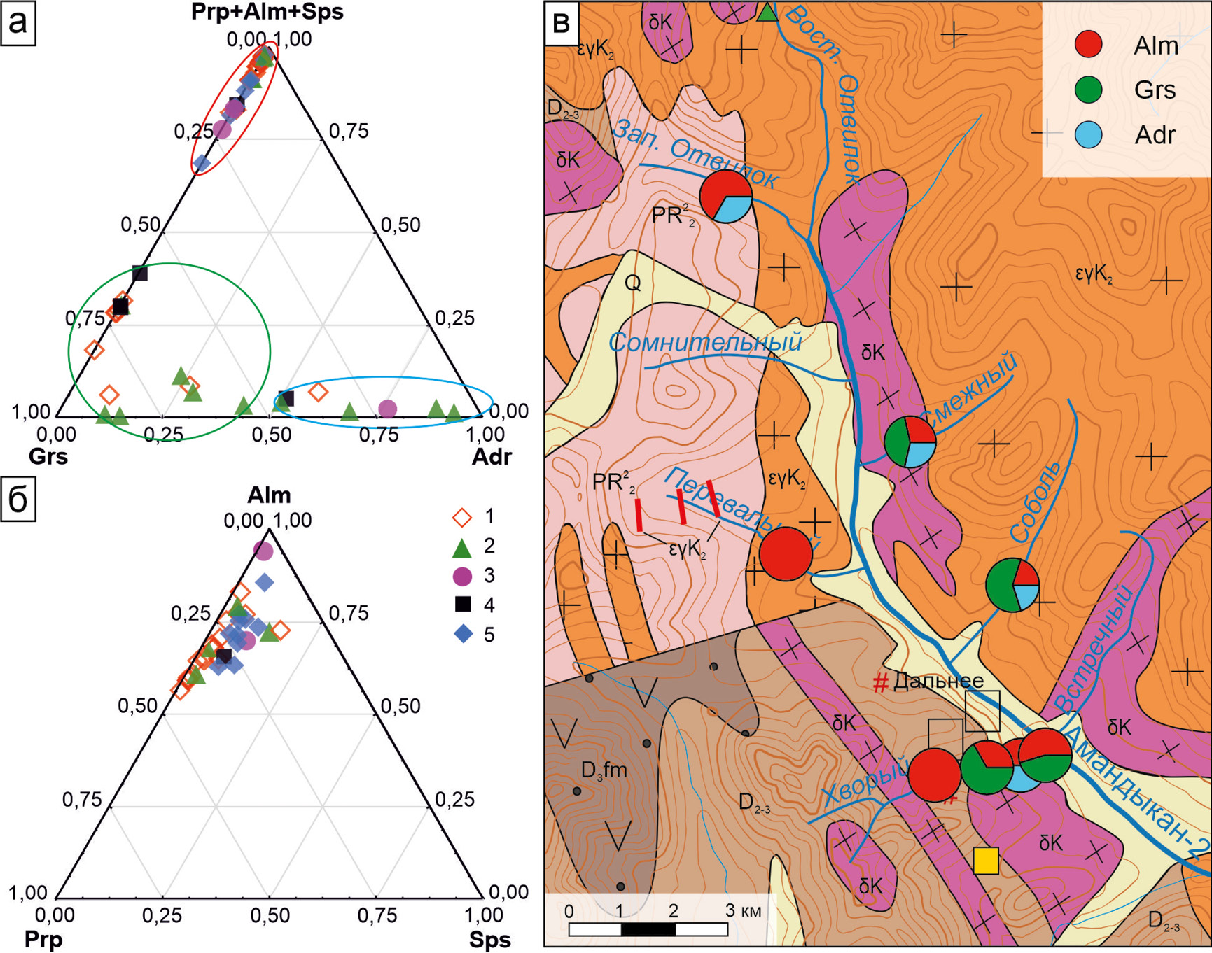 Рис. 6. Состав гранатов из шлиховых проб, отобранных из водотоков бассейна руч. Анмандыкан 2-ой: а – гранаты альмандинового (красный), гроссулярового (зеленый) и андрадитового (голубой) составов; б – состав альмандиновых гранатов из шлиховых проб, отобранных из водотоков бассейна руч. Анмандыкан 2-ой; в – картосхема значений состава гранатов в точках. Здесь и на рис. 9–11, расшифровка легенды на рисунке 1. Ручьи: 1 – Хворый; 2 – Смежный; 3 – Западный отвилок; 4 – Соболь; 5 – Перевальный.