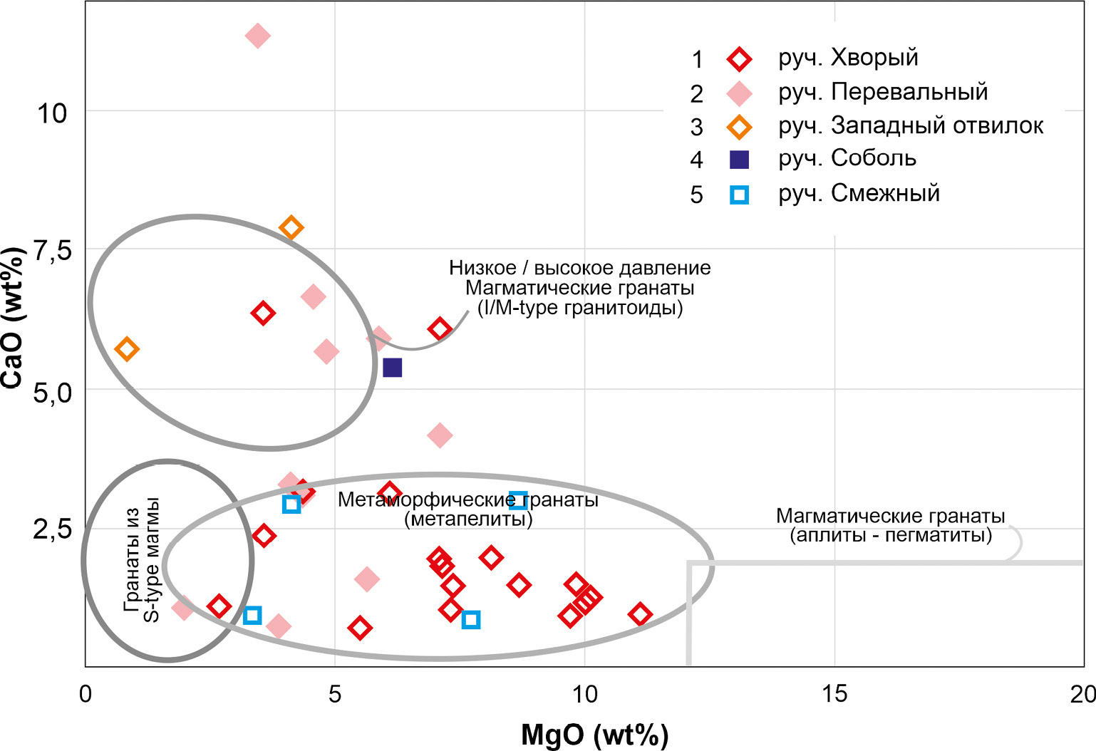 Рис. 8. Соотношение содержаний MnO и CaO в гранатах из шлиховых проб, отобранных из водотоков бассейна руч. Анмандыкан 2-ой. Ручьи: 1 – Хворый; 2 – Перевальный; 3 – Западный отвилок; 4 – Соболь; 5 – Смежный. Области состава гранатов для различных пород взяты из (Samadi et al., 2014).