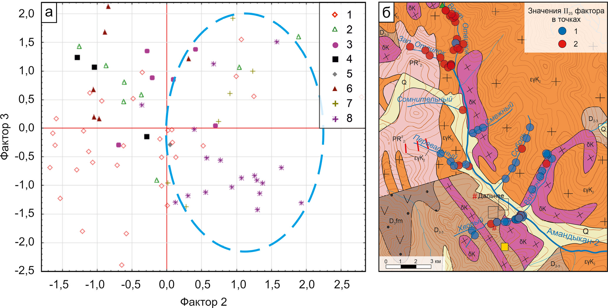 Рис. 11. а – диаграмма значений факторов I и III: зеленая линия – отрицательные нагрузки фактора III (Al, Si, Mg, Sr, Au, Ca, As, Rb, Fe); б – картосхема значений фактора III в точках отбора шлиховых проб.