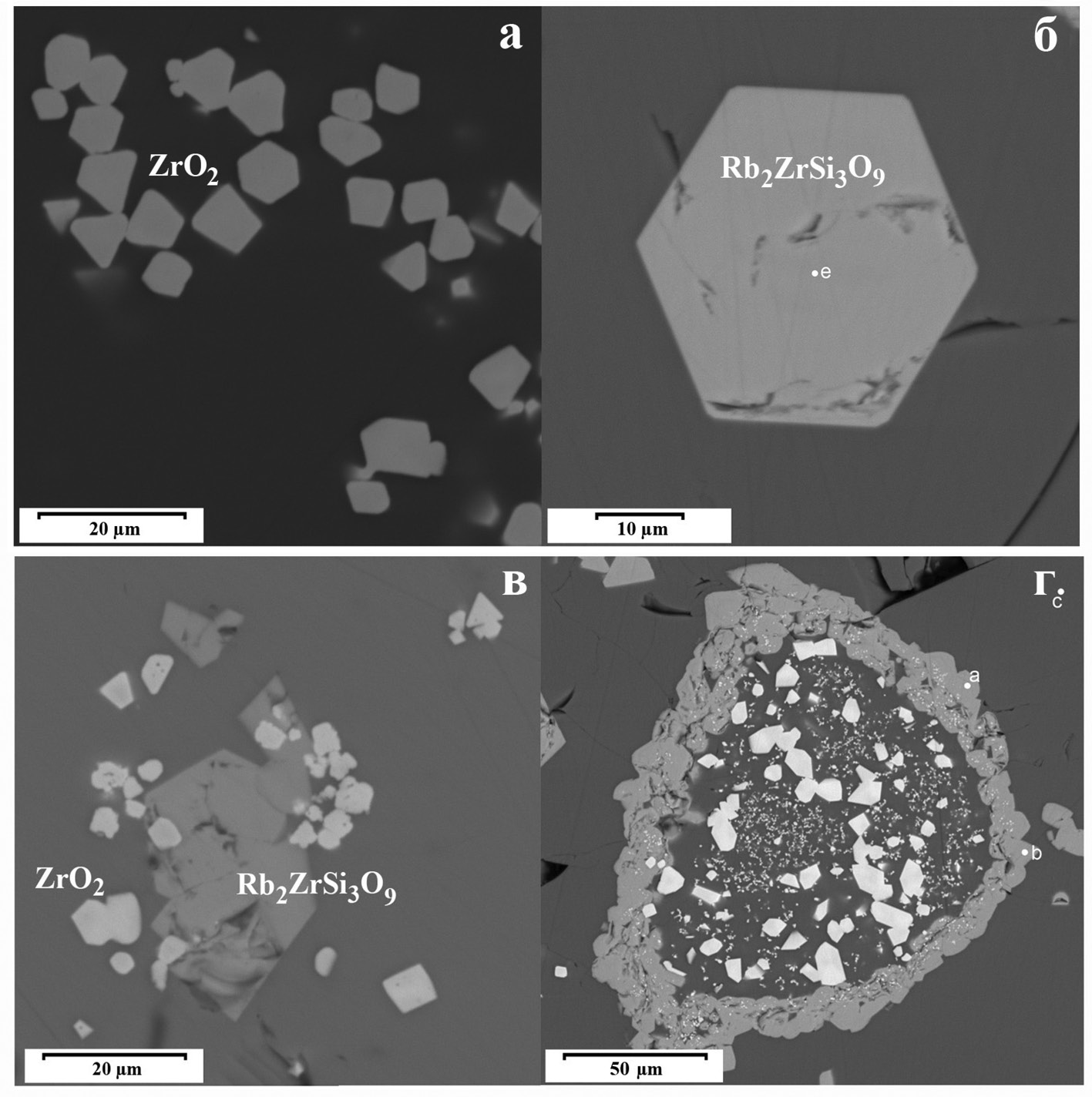 Fig. 1. BSE images of baddeleyite (а, в, г) and Rb zirconosilicate (б–г) crystals in synthesized samples. Points a, b, c, e – analyzed areas.