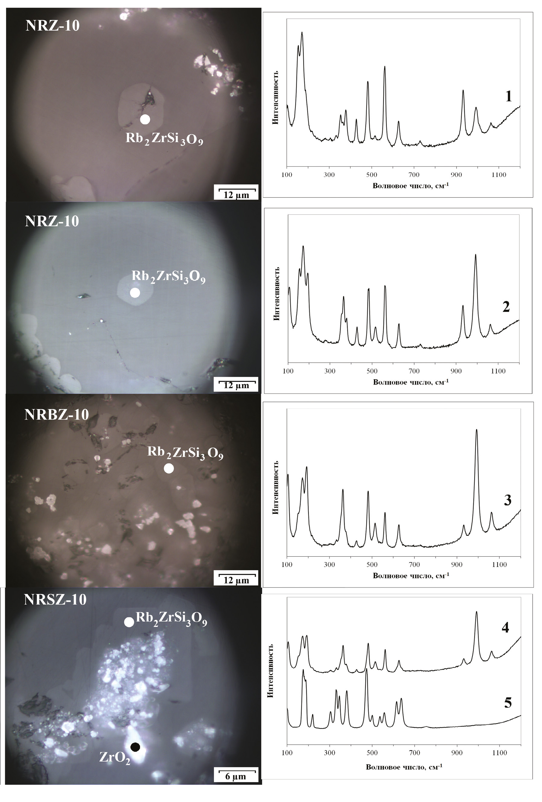 В спектрах КР кристаллов состава ZrO2 присутствуют две интенсивные линии с максимумами около 480 и 620 см-1 (рис. 3, спектр 5), что соответствует эталонным спектрам бадделеита (база данных RRUFF) (Fewox et al., 2007). Спектры КР кристаллов Rb2ZrSi3O9 имеют один и тот же более сложный набор полос: три близко расположенные 160, 170 и 190 см–1 в низкочастотной части спектра, полосы 360, 430, 480, 515, 560 и 620 см–1 в средней части спектра и полосы 930, 990 и 1060 см–1 в высокочастотной части спектра. Соотношение интенсивности этих полос значительно отличается для разных выбранных кристаллов, что связано с их разной ориентировкой по отношению к плоскости образца (рис. 3, спектры 1–4).