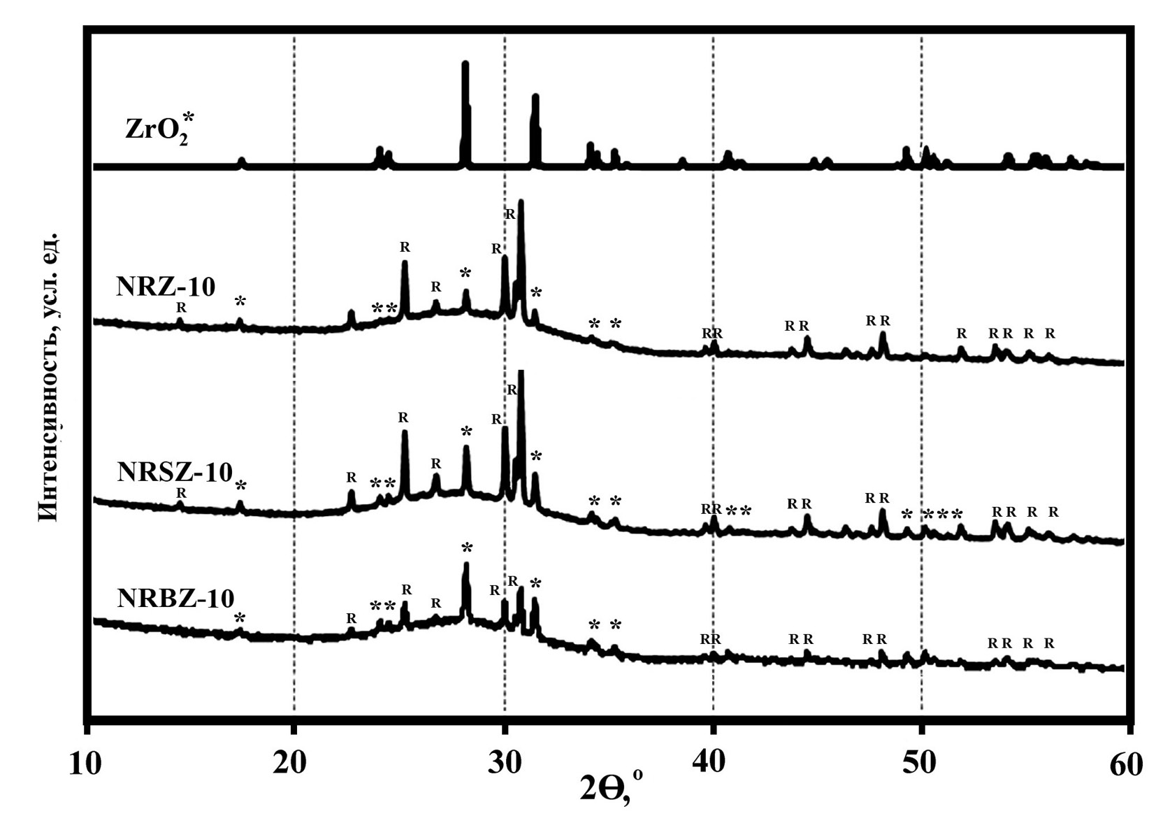 Рис. 4. Дифрактограммы синтезированных образцов. * – отражения, соответствующие бадделеиту, (Lafuente et al., 2015); R – Rb2ZrSi3O9.