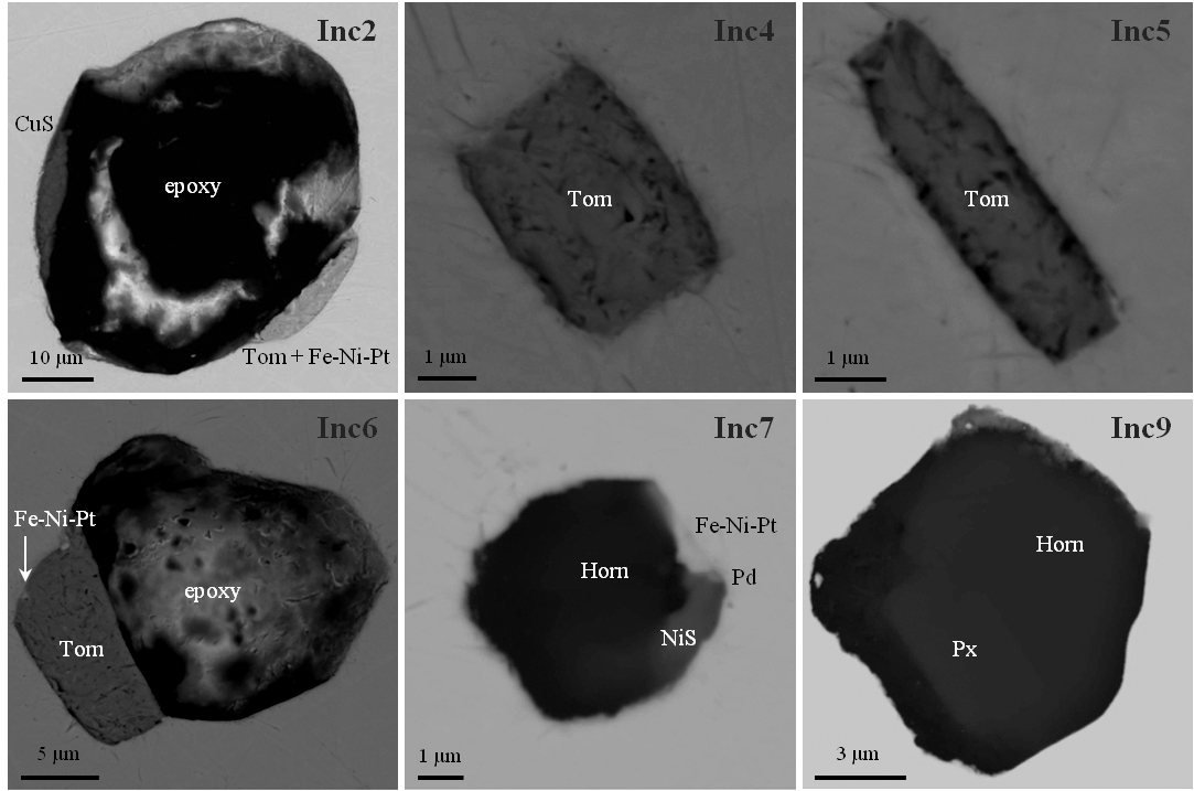 CuS – digenite/roxbyite; Tom – tomamaeite; Fe-Ni-Pt – Fe-Ni-Pt alloy; Pd – Pd mineral; NiS – millerite; Horn – magnesio-hornblende; Px – low-Ca pyroxene; epoxy – epoxy resin.