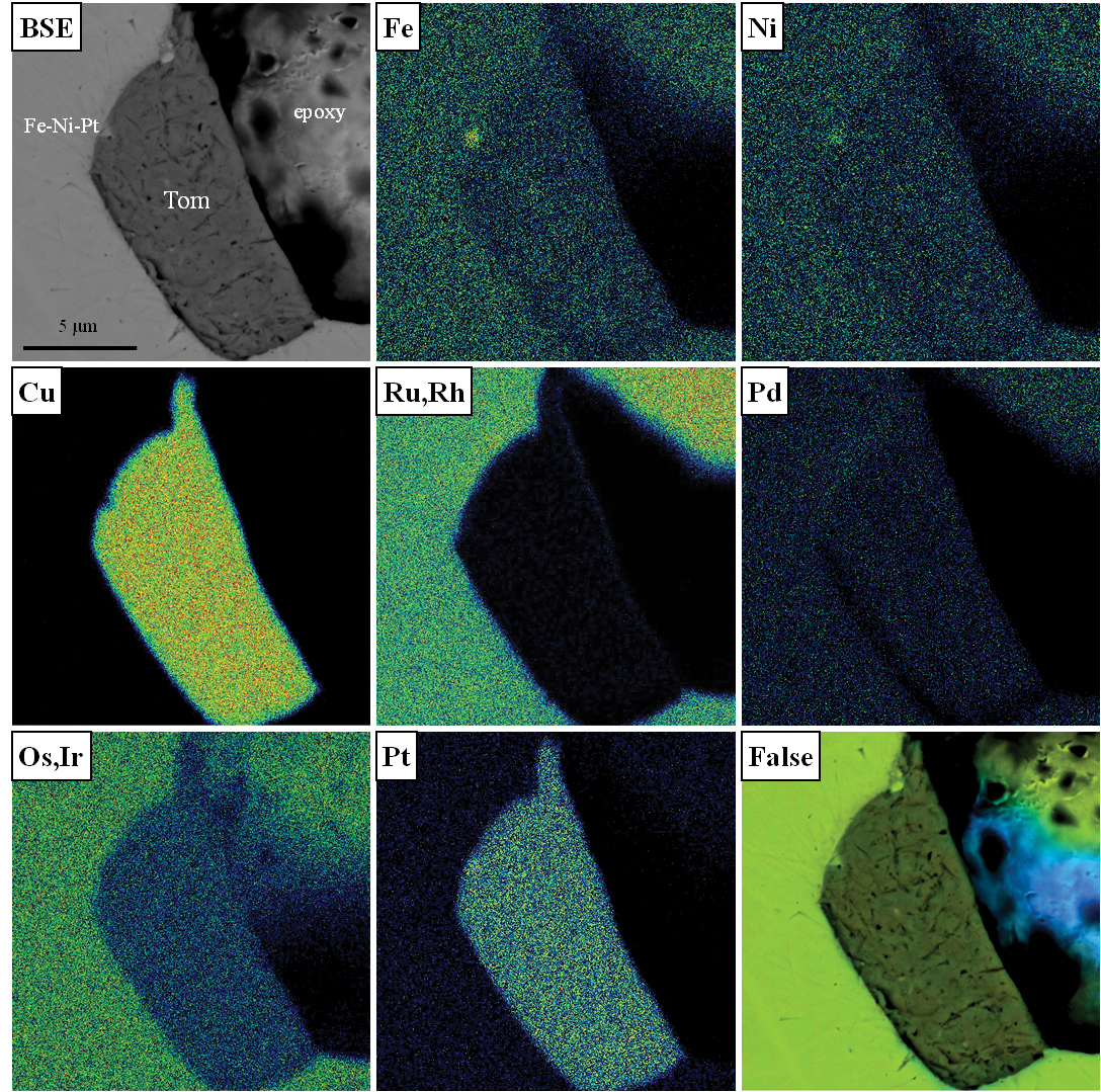 Fig. 3. Tomamaeite (Tom) grain and elemental maps of inclusion Inc6 in native osmium grain (9902-1), Nizhnie Sergi area, Central Urals.