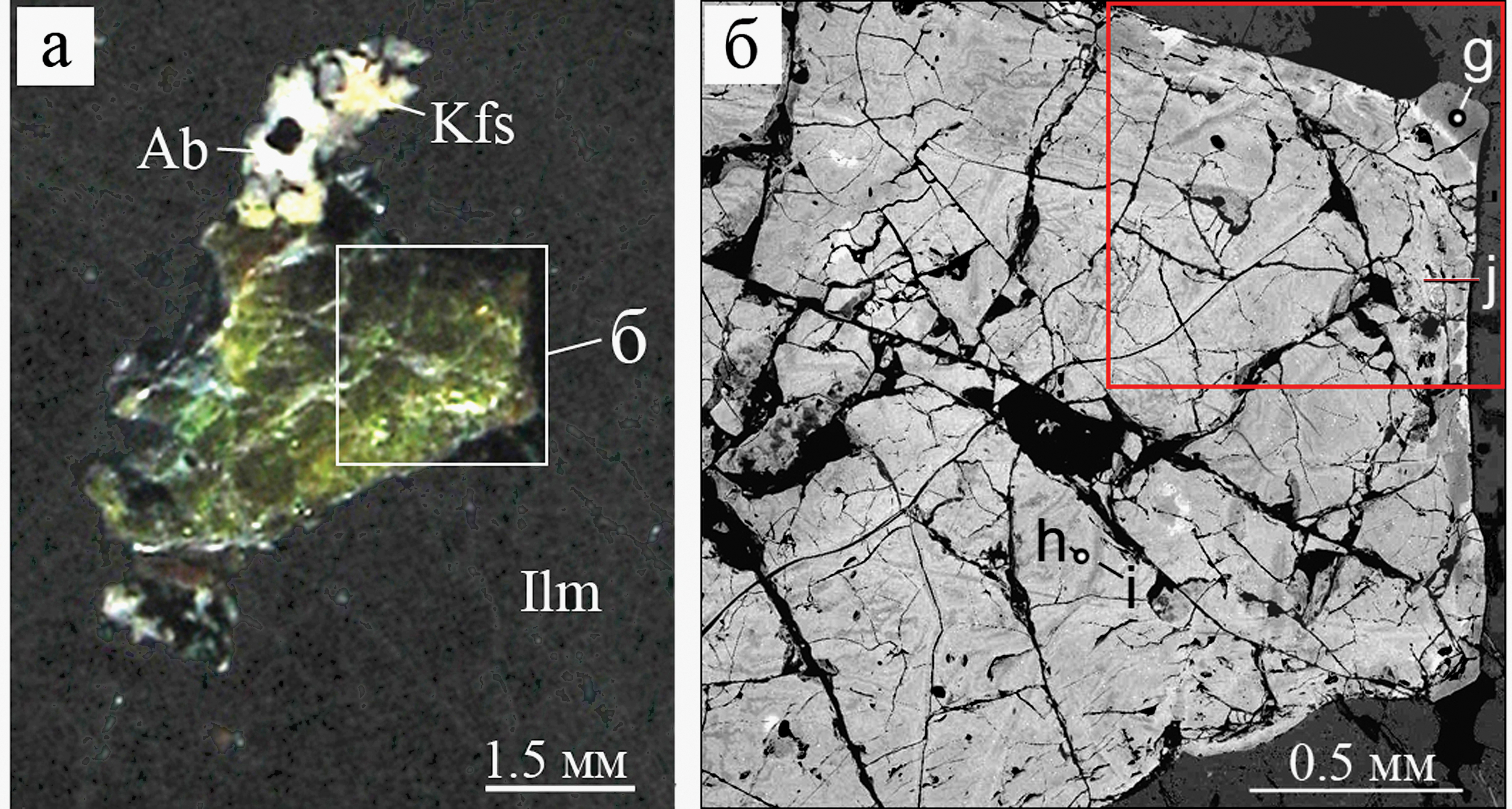 а – отраженный свет; б – BSE фото (красным оконтурен участок элементного картирования); g, h, i, j – точки анализа в таблице. Ab – альбит, Kfs – калиевый полевой шпат, Ilm – ильменит.