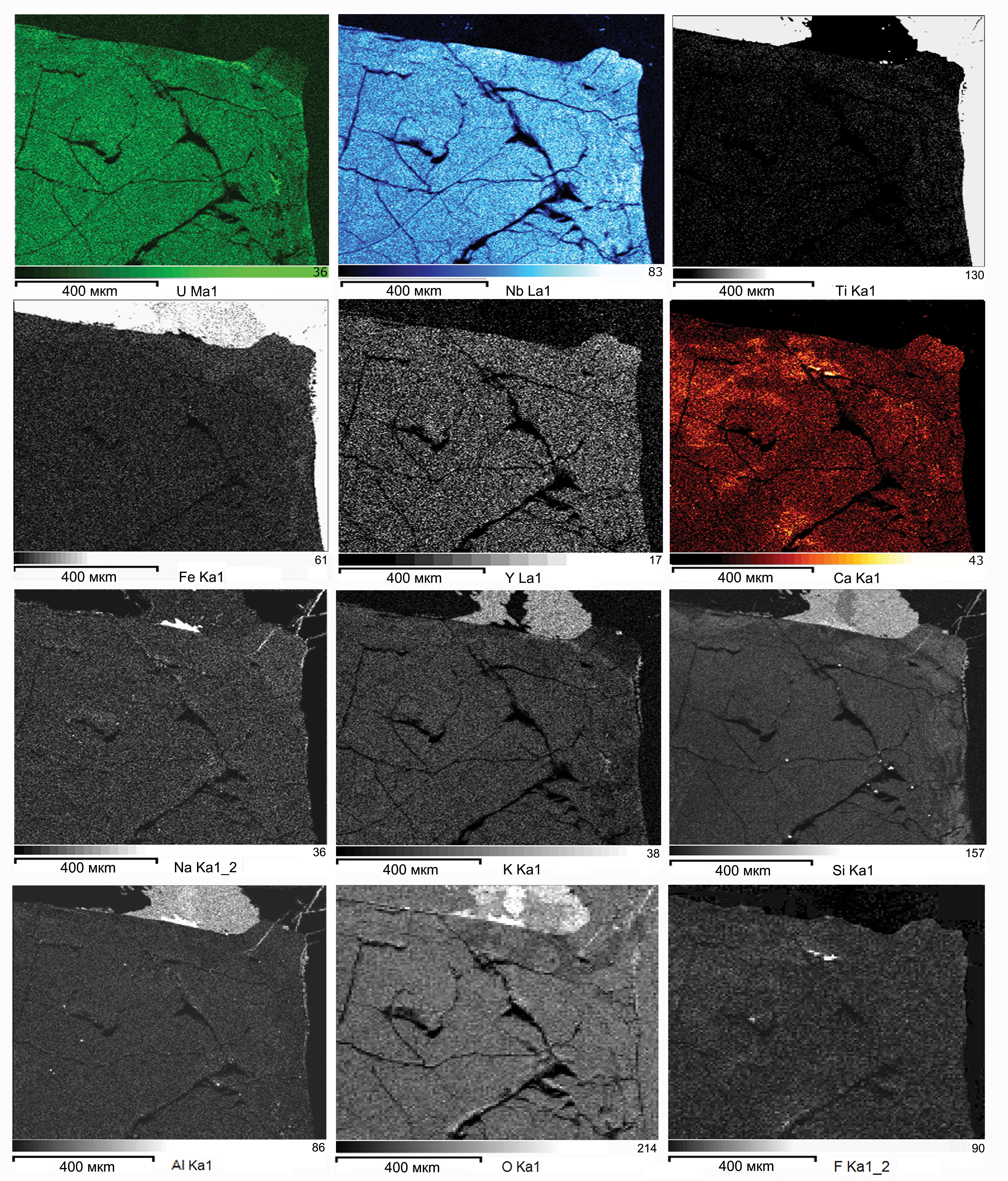 Для участка зерна получены карты распределения содержаний Nb, Ti, U, Ca, Na, K, Fe, Y, Si, Al, O и F (рис. 4). Периферическая часть этого участка измененного зерна «уранпирохлора» немного обогащена Nb, Si, Fe, но обеднена U, Ca и Al. На внешней поверхности зерна «уранпирохлора» выявлены наросты шамозита, аннита, калиевого полевого шпата, альбита и натролита, а в полостях тонких трещин – отдельные микрозерна уранпирохлора и флюорита.