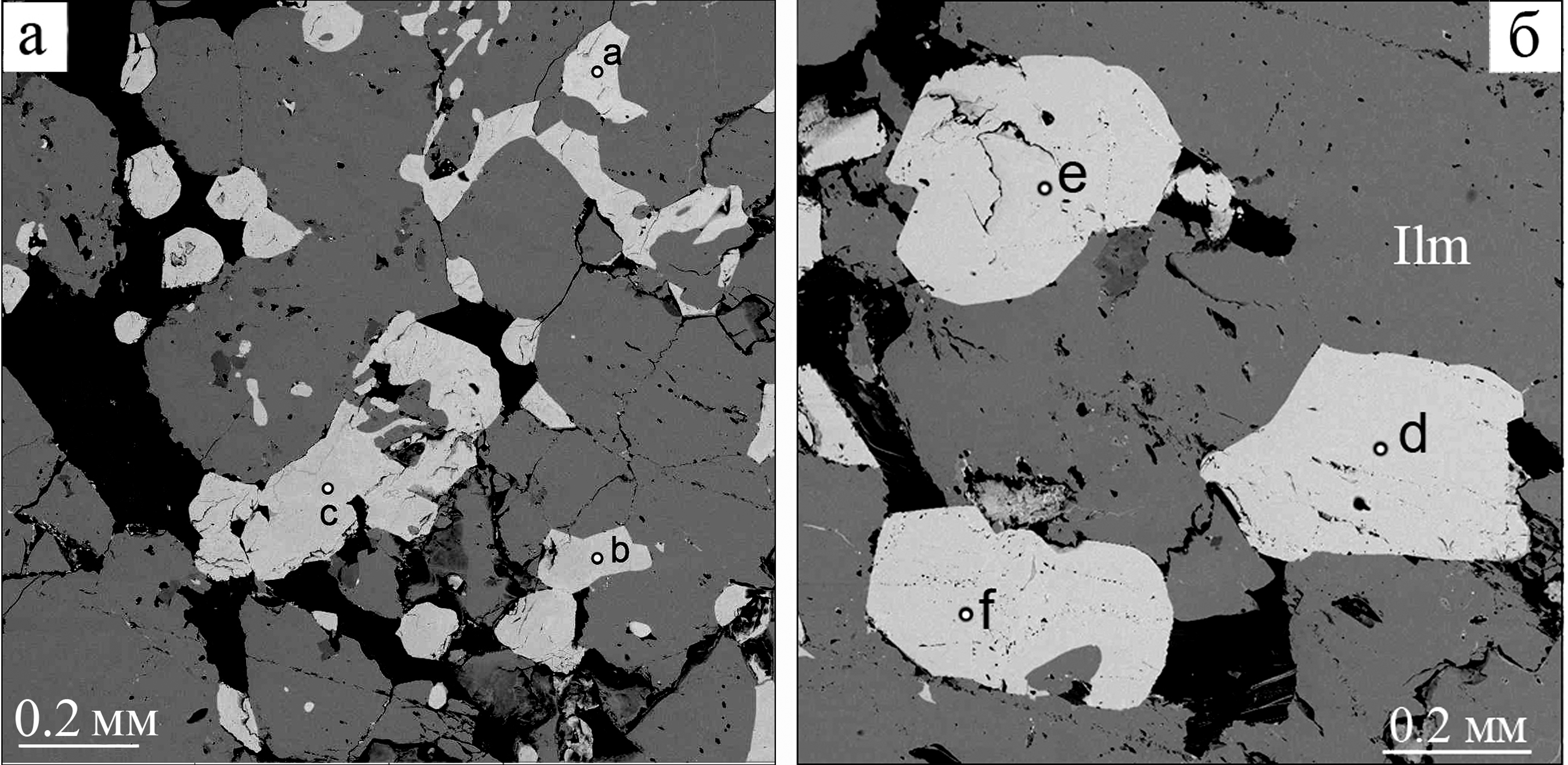 За пределами желтовато-зеленого зерна «уранпирохлора» зерна ферсмита и коричневого фторкальциопирохлора характеризуются сложными (индукционными) ограничениями в результате их сокристаллизации с ильменитом, полевыми шпатами и слюдами (рис. 5). Cодержание Nb2O5 в ферсмите составляет ~60 мас. %, уран не обнаружен; в некоторых анализах присутствует небольшая примесь SiO2 (рис. 5а; таблица, ан. 5a, 6b); В составе фторкальциопирохлора определены обычные высокие содержания оксидов Ca, Na, Nb, F при меньших – Ti и почти полном отсутствии U (таблица, ан. 7c, 8d, 9e, 10f).