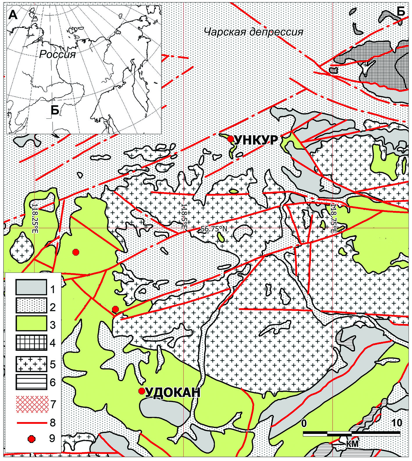 Рис. 1. Географическое положение (A) и схема геологического строения района Удоканского и Ункурского месторождений (Б) по (Буфеев, Щербакова, 1978) с упрощениями.