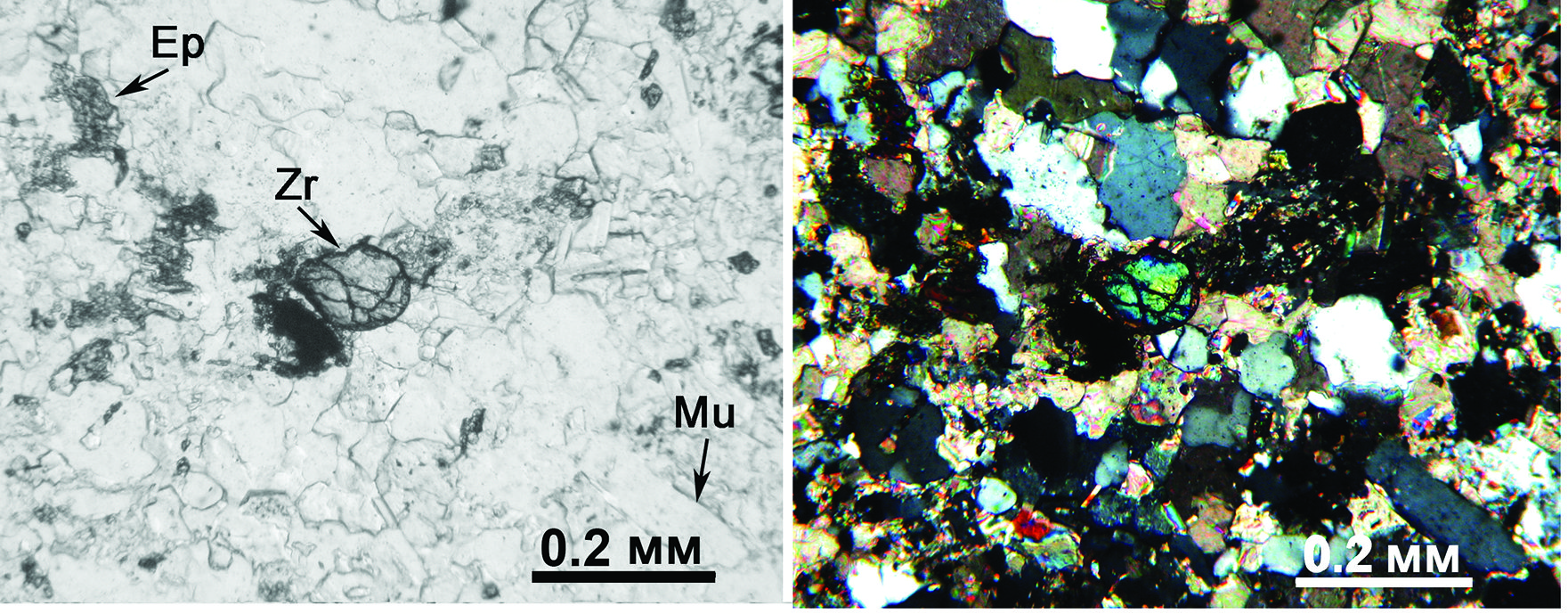 Минеральный состав метапесчаников. Нами изучены образцы метапесчаников сакуканской свиты, обогащенные оксидами железа. Текстура пород полосчатая, реликтовая слоистая (рис. 4, 5), структура мелкообломочная, цемент тонкозернистый, наложенная структура гранолепидобластовая. Метапесчаники состоят из обломочных зерен кварца и полевых шпатов размером 0.05–1.00 мм, сцементированных агрегатом слюд (биотита, в меньшей степени, мусковита) и кварца, иногда также присутствуют титанит, эпидот. Акцессорные минералы – детритовые апатит и циркон, редко – алланит, турмалин. Оксиды железа представлены магнетитом и гематитом, распределены неравномерно и подчиняются первичной слоистости. Магнетит, часто замещенный гематитом, образует гипидиоморфные и идиоморфные кристаллы размером до 1 мм. Гематит также образует самостоятельные гипидиоморфные зерна. В интерстициях магнетита на Удоканском месторождении развиты тонкозернистые агрегаты гематита и рутила или гематита и титанита. На Ункурском месторождении аналогичную позицию занимают тонкозернистые агрегаты рутила и ильменита.