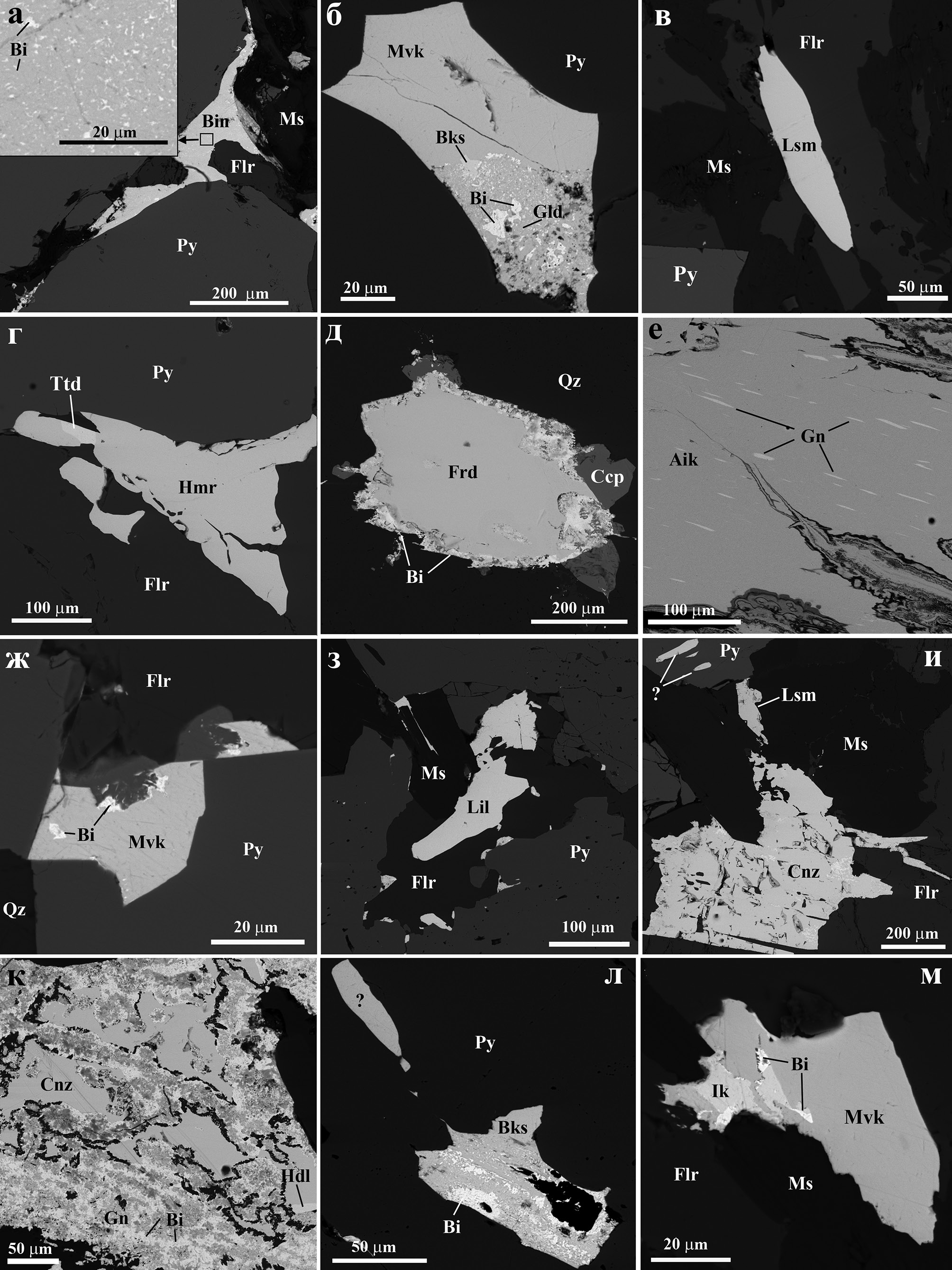 Образцы Юго-Коневского месторождения представляют собой фрагменты кварцевых жил с мусковитом и флюоритом (рис. 3а). Ассоциация рудных минералов включает пирит, сфалерит, галенит, халькопирит и молибденит, образующие полиминеральные агрегаты размером до 5 см. В сульфидах и кварце оптически, электронно-зондовым и, в ряде случаев, монокристальным рентгеновским методами установлены многочисленные кристаллы и зерна сульфосолей Bi висмутин-айкинитовой, павонитовой и купропавонитовой гомологических серий, а также ангелаит, берриит и матильдит. Помимо перечисленных минералов, в данной ассоциации обнаружены самородный висмут, висмутин, гессит, сервеллеит и тетрадимит, образующие вростки размером 5–20 мкм в сульфидах и сульфосолях. В некоторых образцах обнаруживаются редкие индивиды монацита-(Се) до 50 мкм, циркона до 25 мкм и неустановленные до минерального вида оксиды и силикаты U.