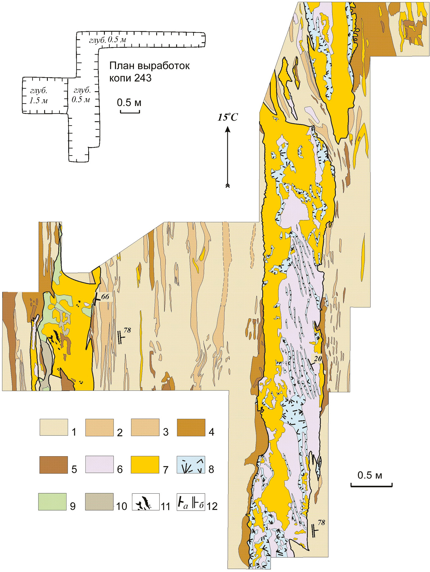 1–3 – Фениты: 1 – лейкократовый; 2 – мезократовый; 3 – меланократовый; 4 – пироксеновая порода с полевым шпатом; 5 – мелко- до крупнозернистая мономинеральная пироксеновая порода; 6 – пироксеновый пегматоид; 7 – друзово-блоковый полевошпатовый пегматит; 8 – пироксеновые друзы с кальцитом; 9 – апатитовый агрегат; 10 – апатит-пироксеновый агрегат; 11 – ильменит; 12 – элементы залегания: а – минерализованных трещин, контактов; б – полосчатости.