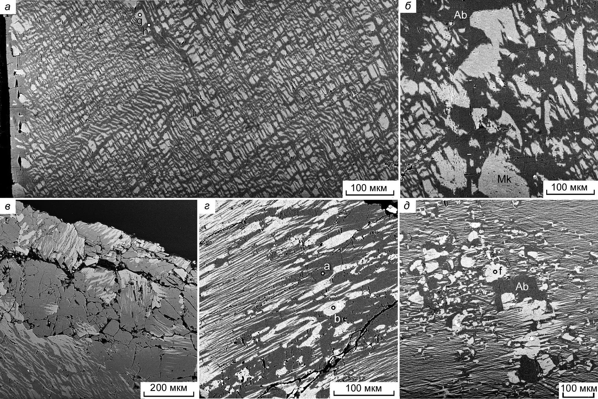 Fig. 4. Structure of mesoperthite feldspar (gray – albite, white – microcline): а–в – longitudinal section of feldspar crystal parallel to (100): а – tweed structure of intergrowths; б – fragment of structure in the center of the crystal; в – fine-grained mesoperthite aggregate at the edge of a large crystal; г – enlarged K-feldspar perthite at the boundary of individuals; д – granular feldspar aggregate in the cavity of mesoperthite monocrystal. Al – albite, Mk – microcline.