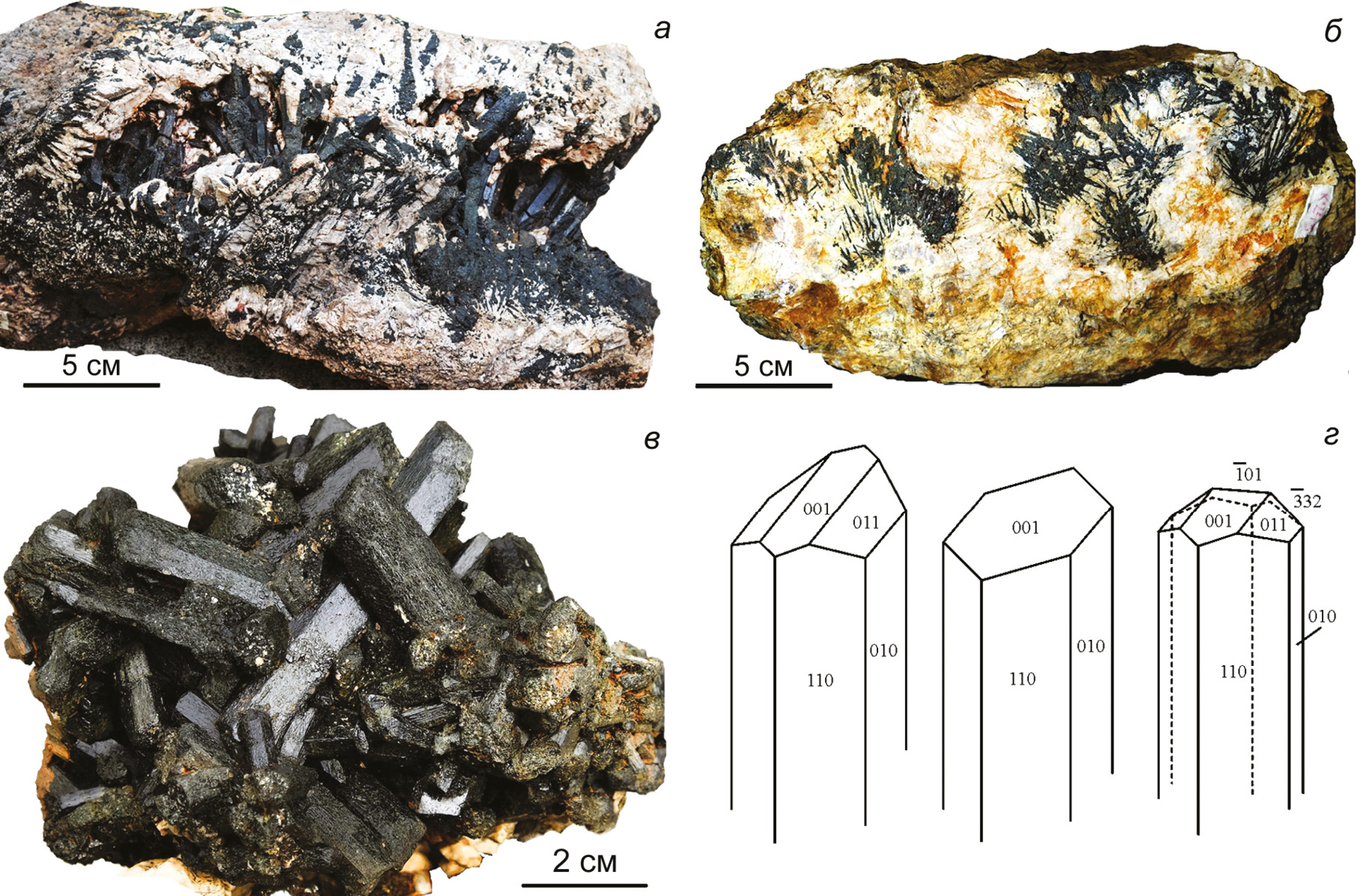 Рис. 5. Кристаллы эгирина в пегматитах копи № 243: а – кристаллы в друзовой щели; б – радиально-лучистые агрегаты в полевом шпате; в – друза эгирина; г – формы кристаллов эгирина.