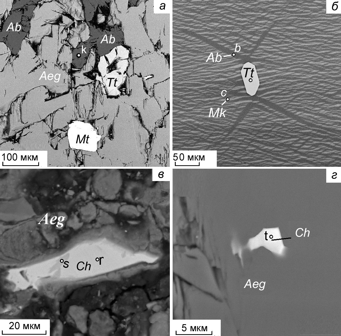 Рис. 10. Включения титанита и чевкинита в минералах пегматита копи № 243: а – титанит (Tt) и магнетит (Mt) в эгирине и альбите; б – мезопертит с кристаллом титанита, у вершин которого наблюдаются трещины напряжения, залеченные альбитом; в, г – включения чевкинита (Ch) в эгирине.