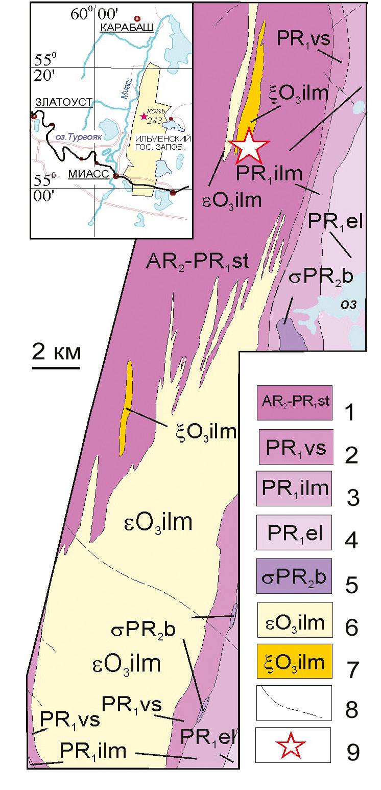 2. Fig. 1. Position of mine no. 243 on geological map of the Ilmenogorsky block, modified after V.Yu. Yuretsky et al. 1–4 – metamorphic sequences: 1 – Selyankino (biotite and garnet-biotite gneiss, pyroxene and garnet amphibolite, biotite and amphibole plagiomigmatite and phenite after them); 2 – Vishnevogorsk (biotite, garnet-biotite, garnet-biotite-sillimanite and sillimanite graphite-bearing gneiss); 3 – Ilmenogorsk (amphibolite, diopside-skapolite-plagioclase rocks, quartzite); 4 – Elanchik (amphibole-biotite, biotite, bicarbonate, garnet-biotite and meso-melanocrate gneiss); 5 – Baik complex (enstatite-olivine rocks and chrysotile-lysardite serpentinite after them); 6, 7 – Ilmeny complex: 6 – miaskite, 7 – syenite; 8 – faults; 9 – mine no. 243.