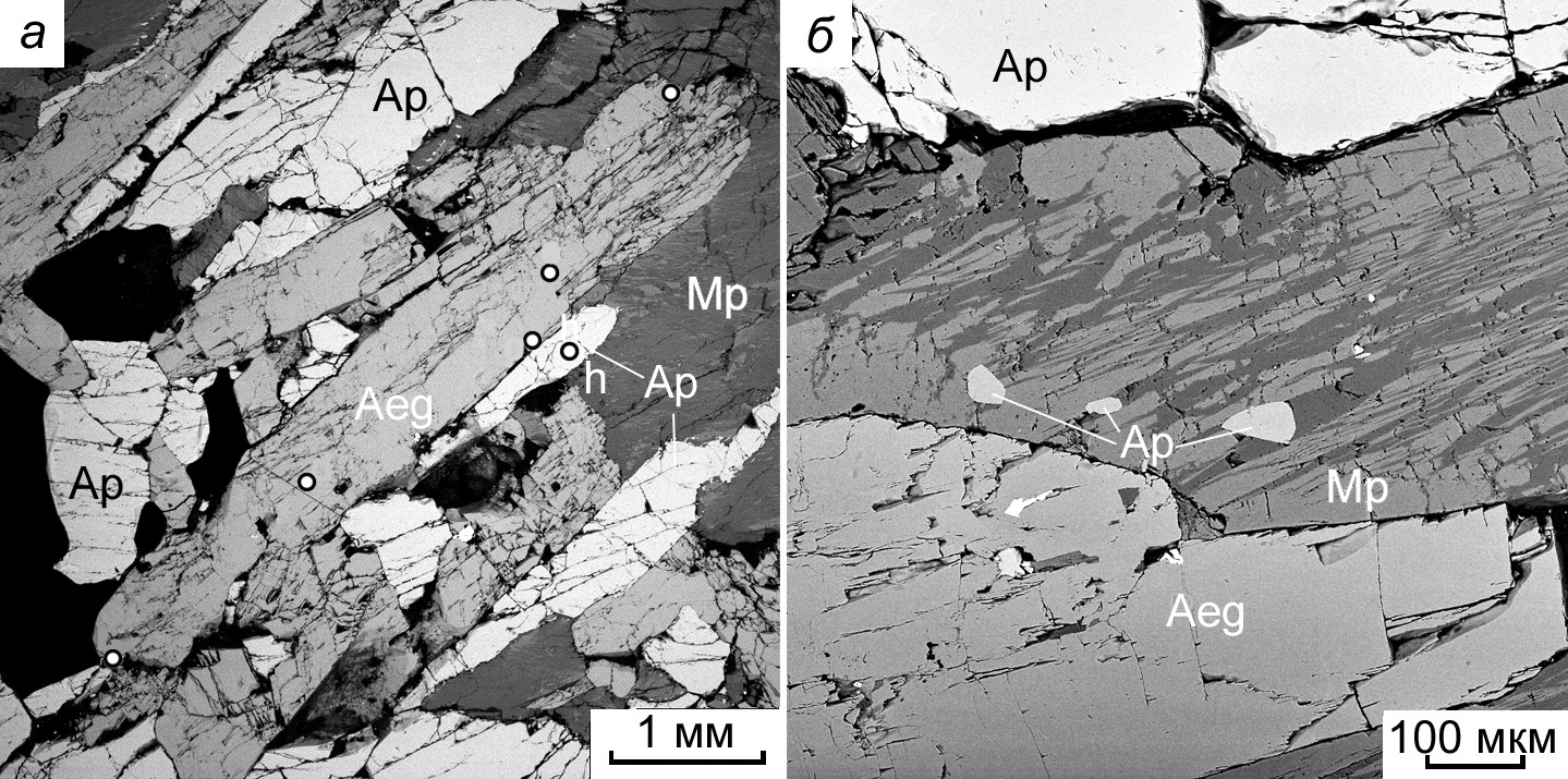 8. Fig. 7. Relationship of rock-forming minerals in apatite-pyroxene-feldspar aggregate: a – intergrowths of apatite (Ap) and aegirine (Aeg); б – apatite inclusions in mesoperthite (Mp).