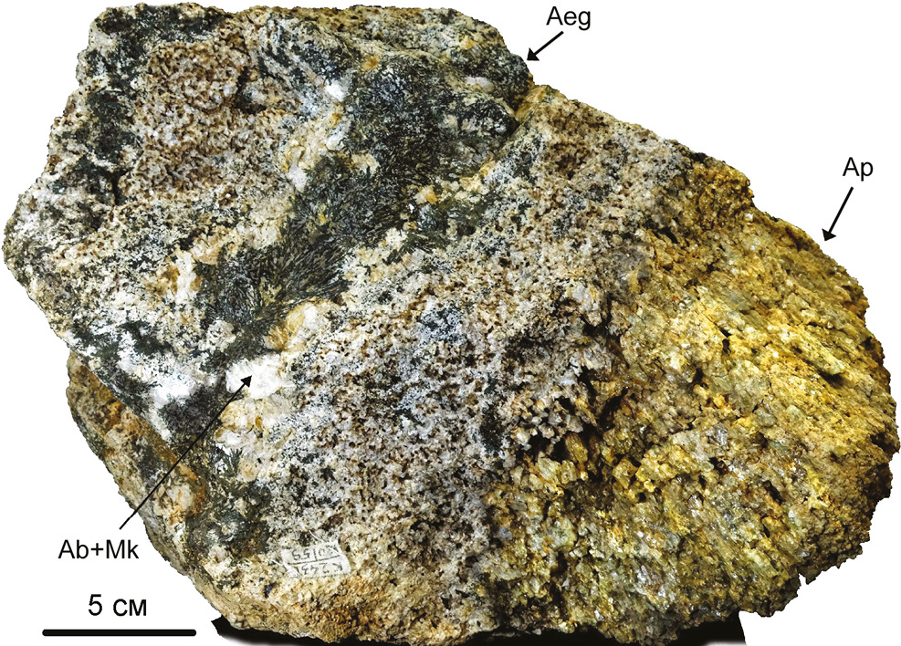 В результате проведенных исследований установлена следующая смена минеральных ассоциаций. К наиболее раннему парагенезису относятся друзово-блоковые полевошпатовые агрегаты. В результате деформаций второго этапа в трещинах кристаллизовались агрегаты, состоящие преимущественно из эгирина с подчиненным количеством полевого шпата. Наряду с новыми генерациями полевого шпата в агрегате регенерировались и дорастали ранее образовавшиеся индивиды. Кристаллизация минералов второго этапа сопровождалась образованием апатита. Ранние генерации апатита в виде включений располагались по зонам роста кристаллов полевого шпата. Основное количество апатита, образующего мономинеральные блоки в западном пегматитовом теле, отлагалось либо совместно с эгирином, либо до него. Здесь агрегаты апатита составляют не менее 30 % объема пегматитовой жилы. Параллельно-шестоватое строение второго типа апатитовых агрегатов указывает на медленное раскрытие вмещающей их полости при их кристаллизации.