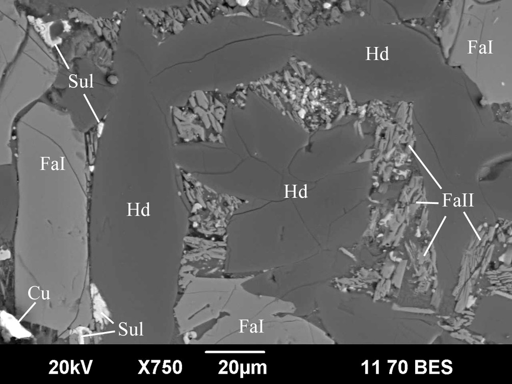 Рис. 6. Самородная медь (Cu) и сульфиды (Sul) в агрегате фаялита I, фаялита II и геденбергита в медном шлаке.