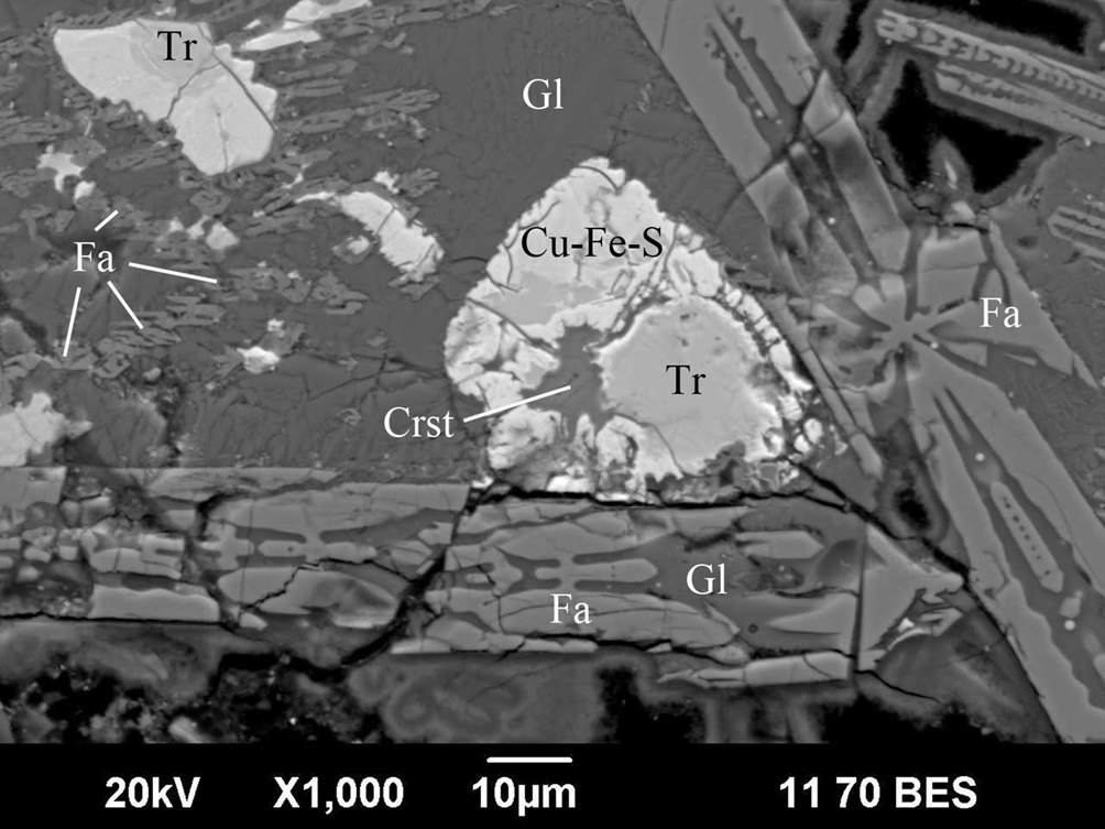Рис. 7. Стекло (Gl) со скоплениями троилита, кронстедтита (Crst), сульфидами Cu и Fe в интерстициях кристаллов фаялита в медном шлаке.