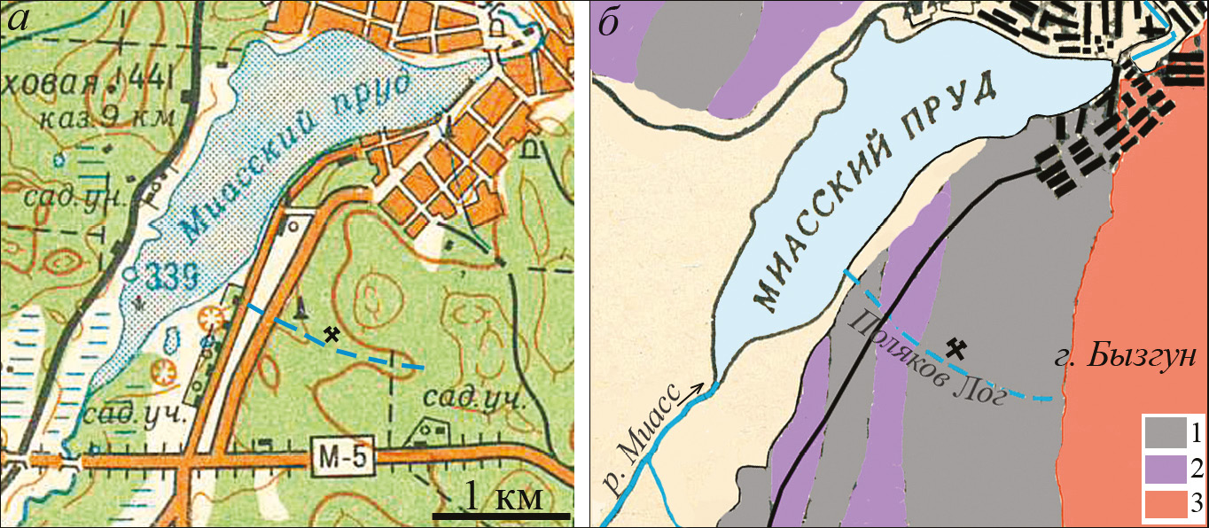 Fig. 1. Position of the Polyakov log garnet occurrence on geographical (a) and schematic geological map (Koptev-Dvornikov et al., 1940) (б) in the area of Miass.