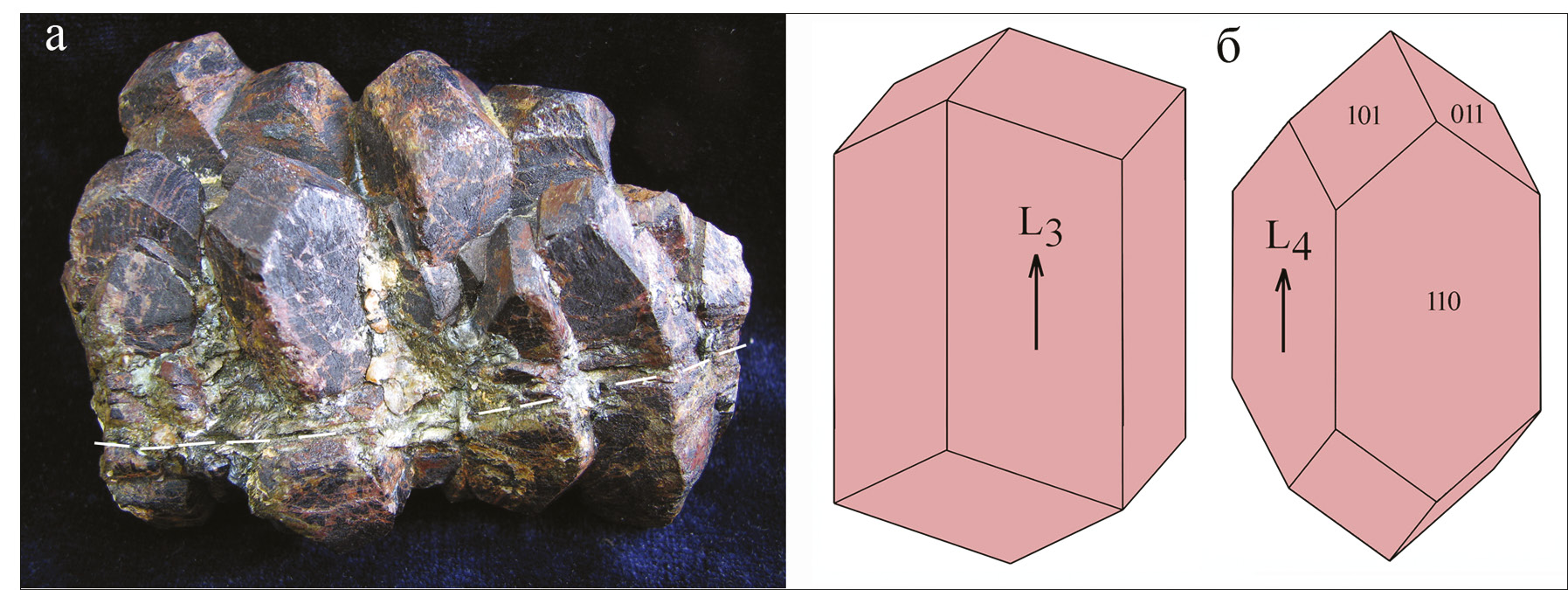 Рис. 4. Асимметрия ромбододекаэдров метакристаллов альмандина: а – друза кристаллов, выросших от трещины во вмещающие хлоритовые сланцы; б – модели ромбододекаэдров, удлиненных вдоль тройной (L3) и четверной (L4) осей. Размер образца 4 см.