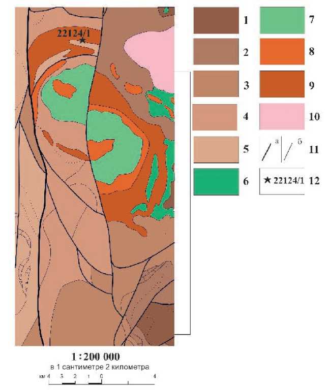 Рис. 2. Геологическая карта Верхнеуральского участка, по (Мосейчук и др., 2017), с упрощениями и изменениями. 1 – базальты и риодациты александринской свиты, средний девон (D2al); 2 – базальты, андезибазальты, андезиты, туфопесчаники и известняки урлядинской толщи, средний девон (D2ur); 3 – базальты и их туфы, аблязовская толща, поздний девон (D3ab); 4 – трахибазальты, трахиандезиты, трахидациты, трахириолиты, их туфы, туфоконгломераты, туфопесчаники, песчаники, конгломераты, известняки верхнеуральской толщи, поздний девон (D3vu); 5 – трахибазальты, трахиандезибазальты, трахиандезиты, трахидациты, трахириолиты, их туфы, тефроиды, туффиты, туфопесчаники, известняки, известняковые конгломераты объединенных новоивановской (D3nv) и шумилинской (D3-C1sm) свит, поздний девон – ранний карбон; 6 – габброиды погорельского комплекса, поздний девон, фран (D3p); 7–9 – интрузивные породы верхнеуральского комплекса, поздний девон, фамен (D3v): 7 – субщелочные диориты, монцониты, субщелочные оливиновые и лейкократовые габбро первой фазы, 8 – кварцевые монцодиориты второй фазы, 9 – сиениты, кварцевые сиениты, кварцевые сиенит-порфиры третьей фазы; 10 – гранитоиды северо-кассельского комплекса, ранний карбон (C1k); 11 – разломы: главные (а), второстепенные (б); 12 – место отбора пробы для датирования цирконов. Геологические границы показаны тонкими линиями.